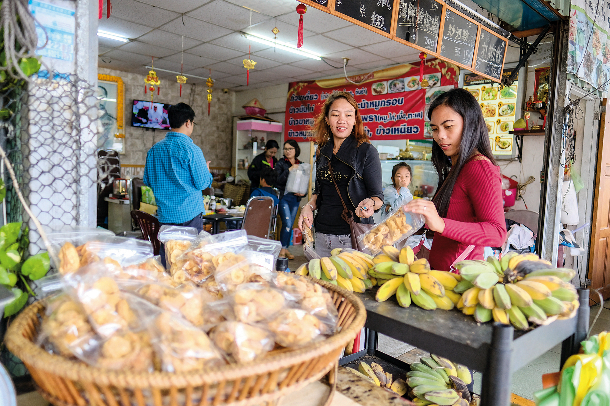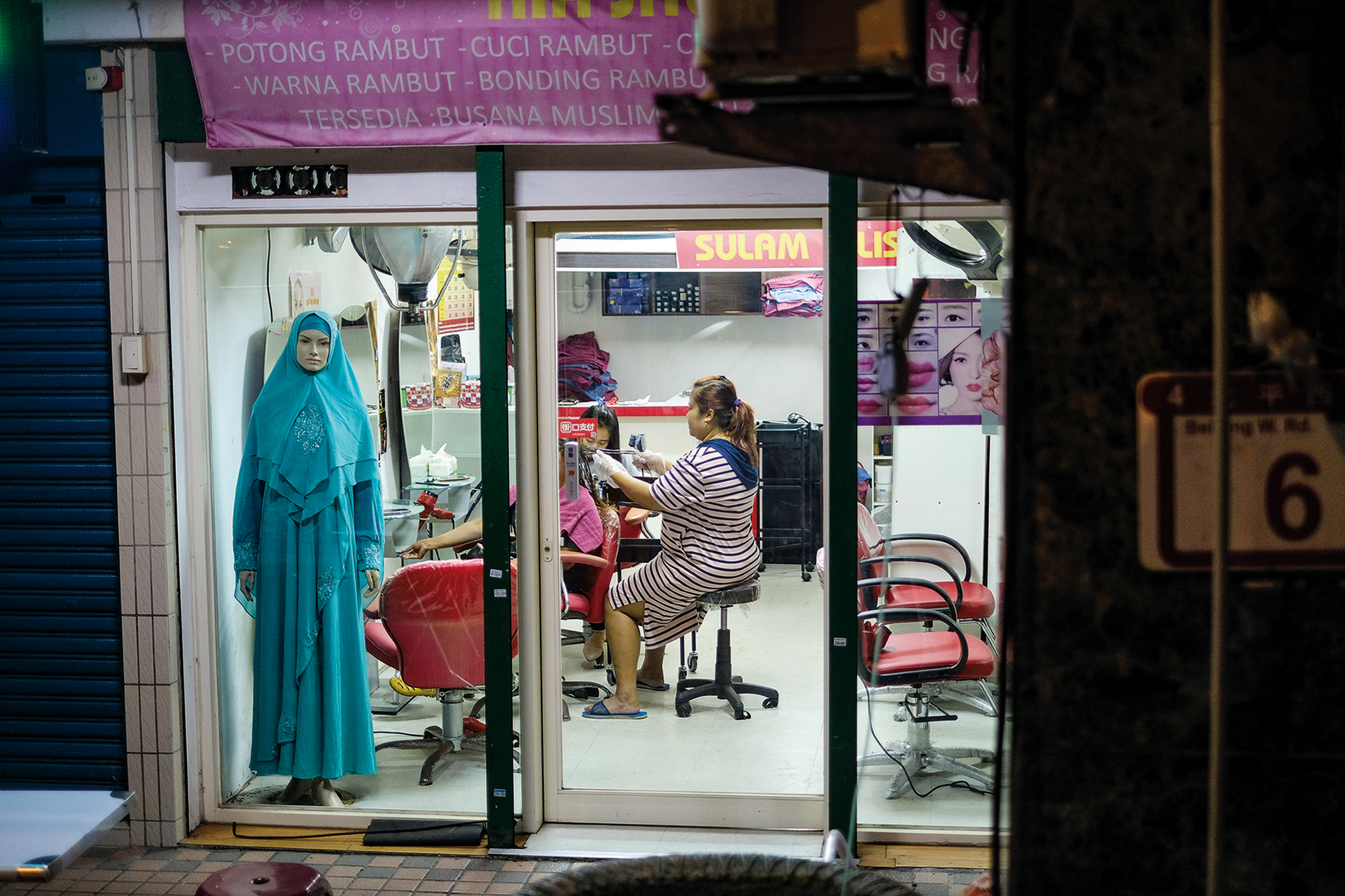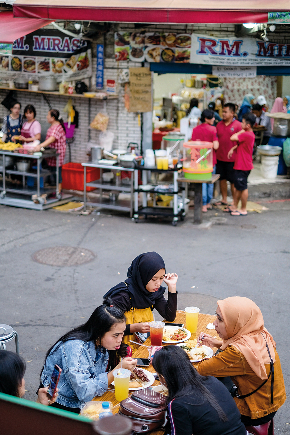 街上店家的服務一應俱全,從美食、雜貨、剪髮到卡拉OK、匯款、傢具都有。首先映入眼簾的是印尼小吃,各式各樣的金黃色炸物:炸香蕉、炸豆腐、炸豆餅,還有沙嗲、娘惹糕,以及種類多樣的自助餐。