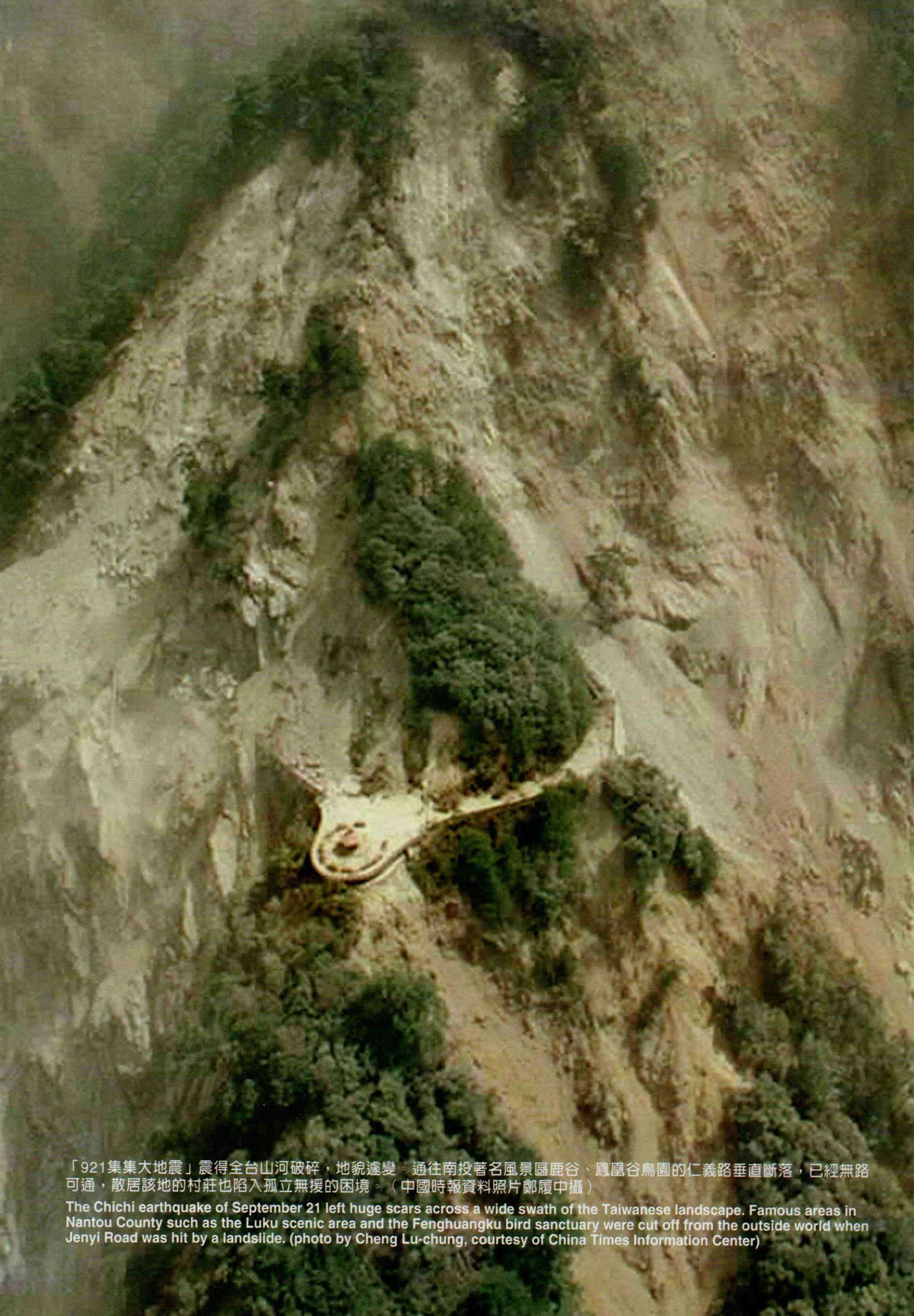 「921集集大地震」震得全台山河破碎,地貌遽變。通往南投著名風景區鹿谷、鳳凰谷鳥圖的仁義路垂直斷落,已經無路可通,散居該地的村莊也陷入孤立無援的困境。(中國時報資料照片鄭履中攝)(中國時報資料照片鄭履中攝)