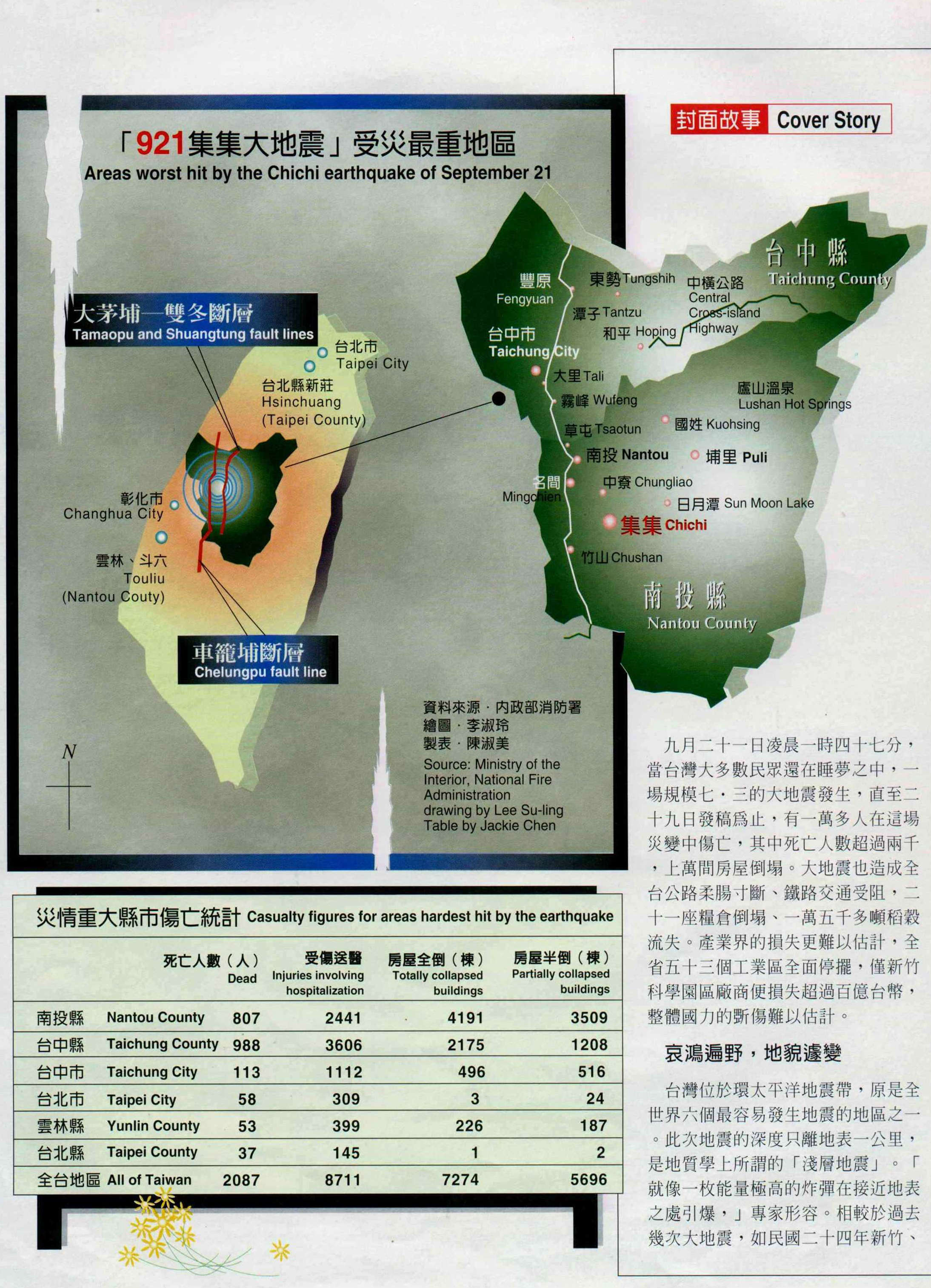 中央大學地球物理研究所教授王乾盈指出,「九二一集集大地震」起因於台灣中部大茅埔──雙冬斷層的推擠,進而帶動西側平行的車籠埔斷 層劇烈抬升,位於斷層帶上的台中縣東 勢、豐原、大里、霧峰等地以及震央附近的南投縣埔里、竹山、名間、中寮等地全被震得山河破碎。強大的震力也 重挫全台各地。台北縣市、苗栗、彰化、雲林、台南等地紛紛傳出災 情,可說除了東部、高雄之外,全台均在此次大地震中受到重創。