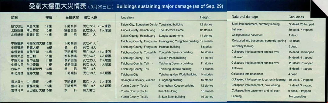 近年台灣都會高樓櫛比鱗次,此次震災也震垮不少被列為「地標」的名門大樓。這些大樓在強震來襲時,有的像積木般的傾倒一邊,有的直沈地底,傷亡動輒上百。「建築法防震門檻 過低」、「營建工人敬業精神不夠」等議論紛紛傳出。還有民眾質疑,看來金玉其外的高樓在大地震中毫無避震能力,反成殺人元凶,這是天災還是人禍,建築商得要有所交代。