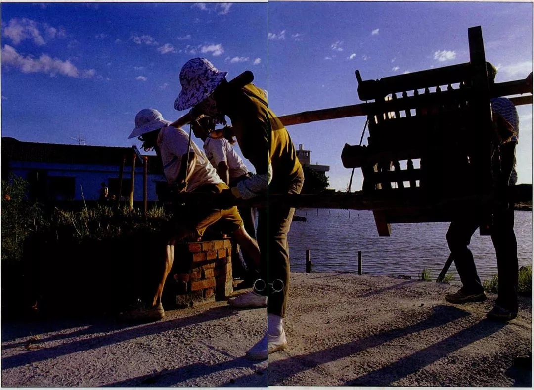 空曠的天地間,婦人們施施地推著小車、或肩挑兩擔,載著牲禮,還有敬神的金紙和祀鬼的銀紙一落落,在近海口河岸的鹽田邊擺成一長排。村內傳來炮竹聲,「來了!來接遊巡王了」,婦人們騷動了起來。