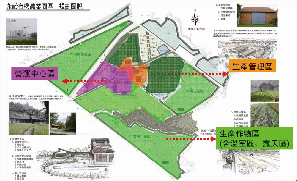 未來各產品收成後,將送到位於園區中央的「集貨理貨廠」進行包裝和運輸管控;每個耕作區都設有「管理小站」,提供員工聚會討論、工具儲放、休息用餐之用;此外,每區也都設有「堆肥舍」──運用園區的落葉、果皮、菜渣等廢棄物做堆肥。