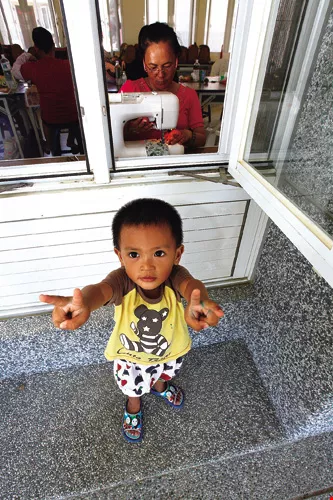 遠離土石流的那瑪夏孩子,跟著媽媽在大愛村拼布班的教室外玩耍。