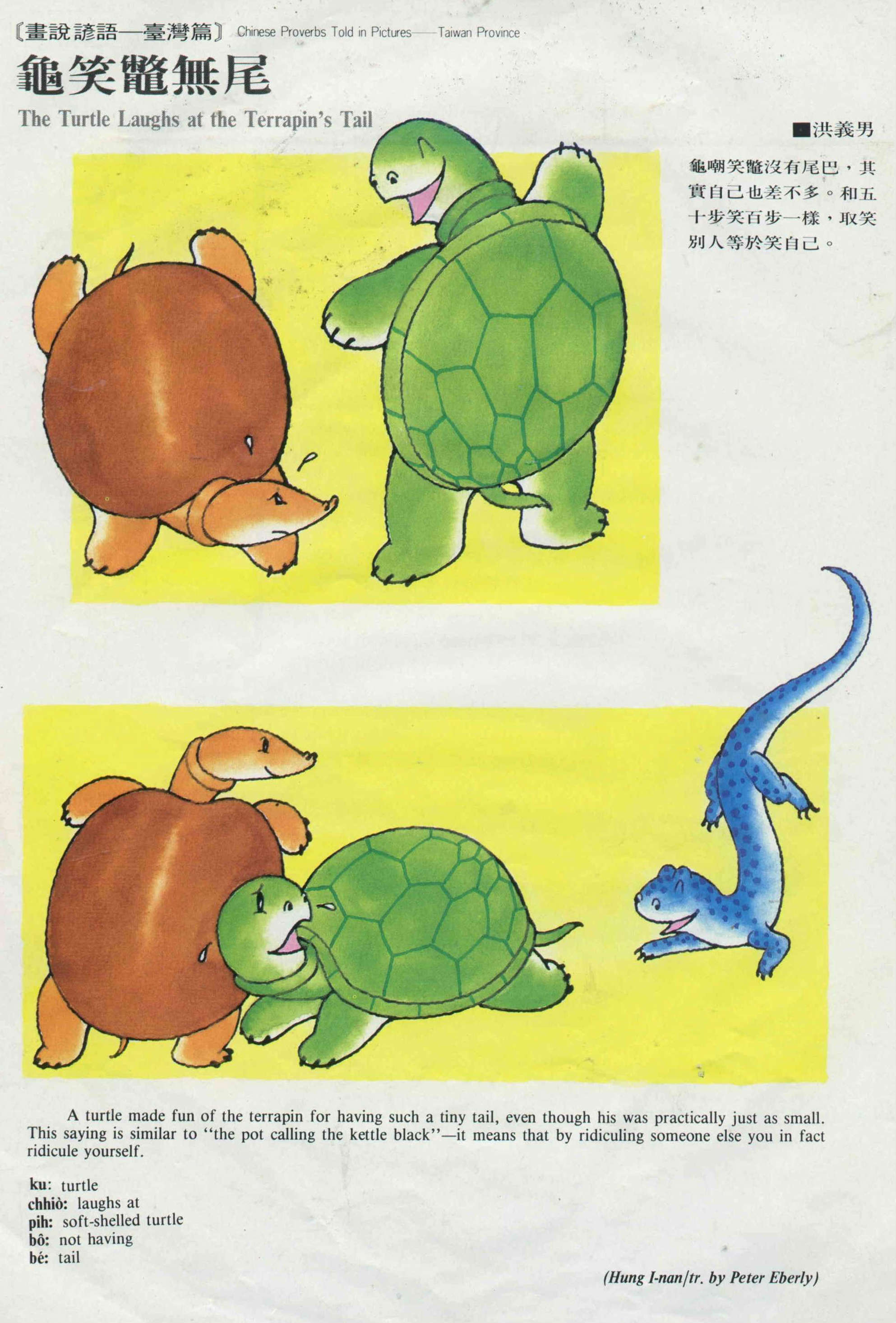 龜嘲笑鱉沒有尾巴,其實自己也差不多。和五十步笑百步一樣,取笑別人等於笑自己。