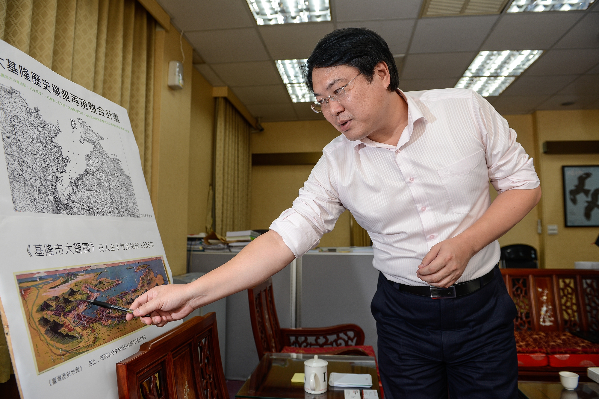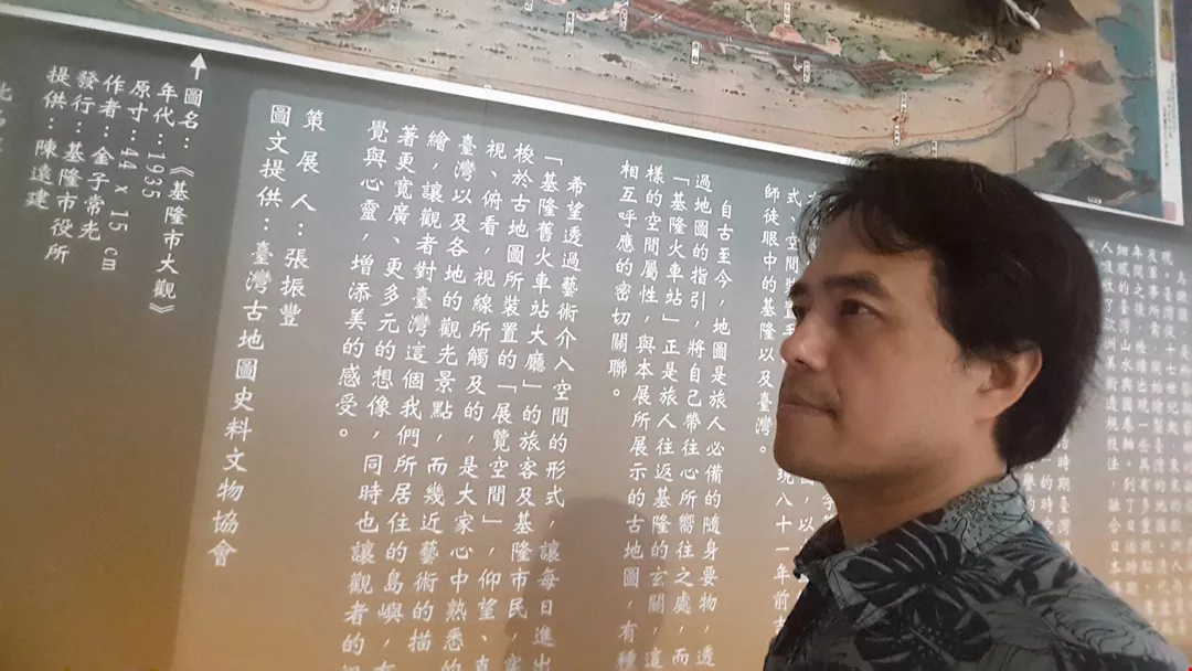 文史工作者張振豐利用基隆舊火車站一隅策畫「跨越時空的城市之旅──台灣八景暨古地圖特展」。(台灣古地圖史料文物協會提供)