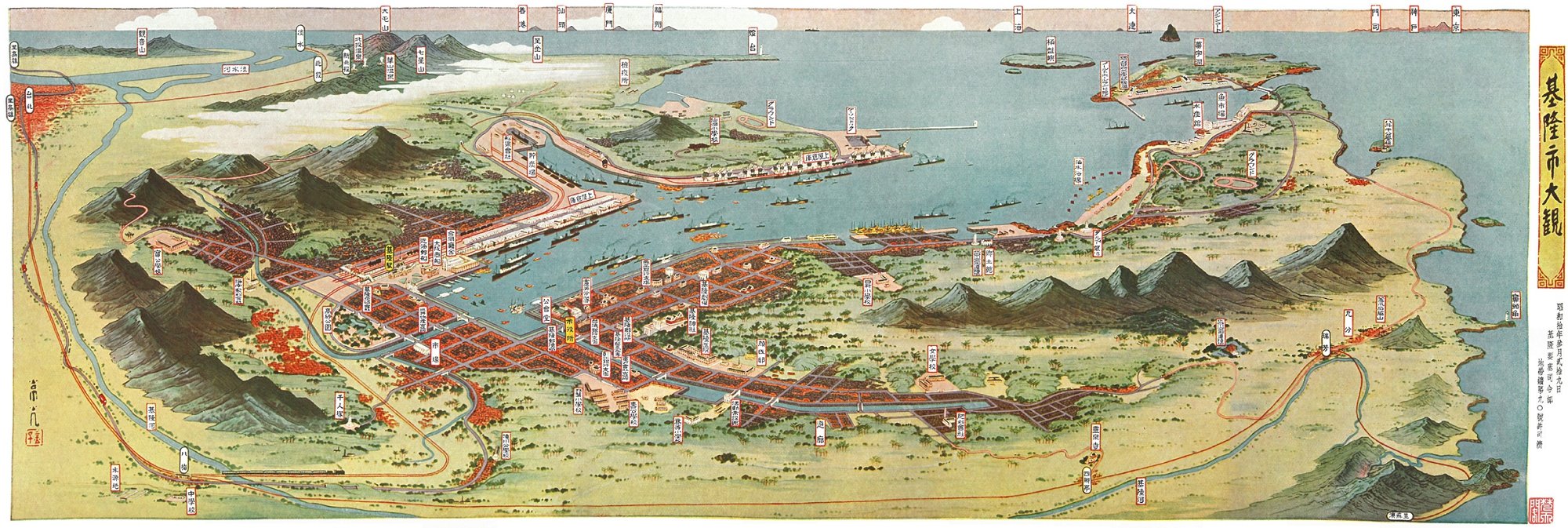 這些鳥瞰古地圖出自日本畫家吉田初三郎、金子常光師徒數人之手,完成在1933~1935年間。1930年代初期,他們應日本總督府舉辦「始政四十年紀念台灣博覽會」的邀請走訪台灣,籌劃、描繪出《臺灣鳥瞰圖》、《基隆市大觀》、《臺北州大觀》、《淡水郡要覽》、《臺中市要覽》、《新高山岳與日月潭》、《恆春要覽》、《花蓮港廳大觀》和《觀光之花蓮港》等數十幅地圖來呈現台灣島的地形地貌與風情景物。