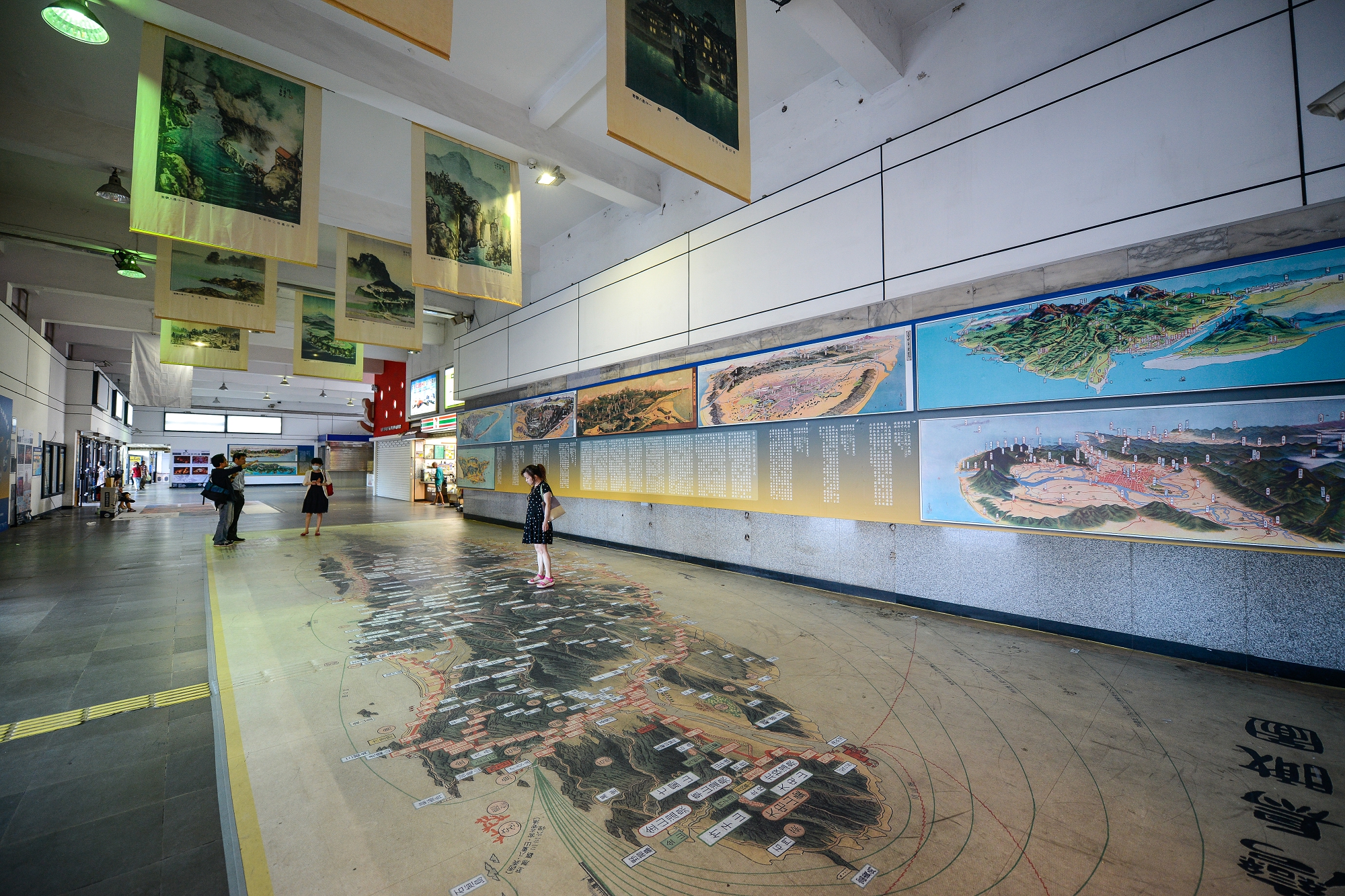 展覽設在舊火車站一隅,行人旅者前往轉運站總是經過而忽略的地方;不過,急忙的步履現在不知不覺會停下來,先被腳下超級大幅的台灣古地圖攫住目光,再被周圍的鳥瞰地圖吸引。「古地圖本身就有股魔力,讓你一靠近便不想離開。」策展人張振豐說。