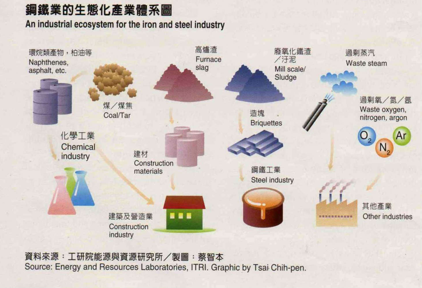 若是資源化做得好,其實「上中下游產業可以連結成食物鏈,」工業技術研究院能源與資源研究所環保計畫總主持人巢志成,用生態學來比喻產業界環環相扣的情形。