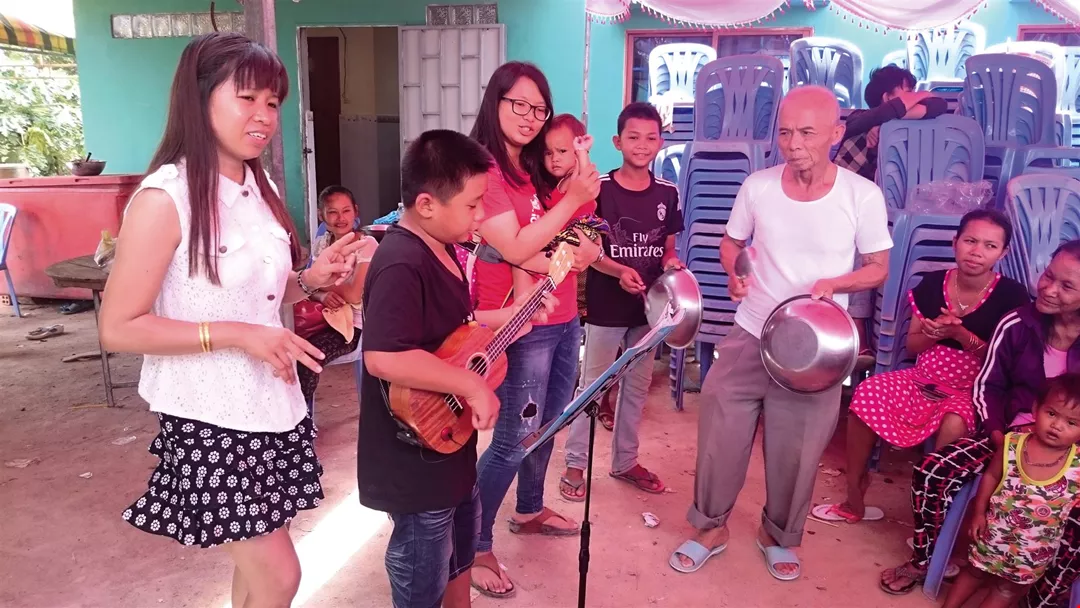「嘉義縣外婆橋教育關懷協會」補助了松梅國小林柏文母子回柬埔寨,林柏文在家鄉表演烏克麗麗,眾人拿鍋歡喜伴奏,形同演唱會一般。