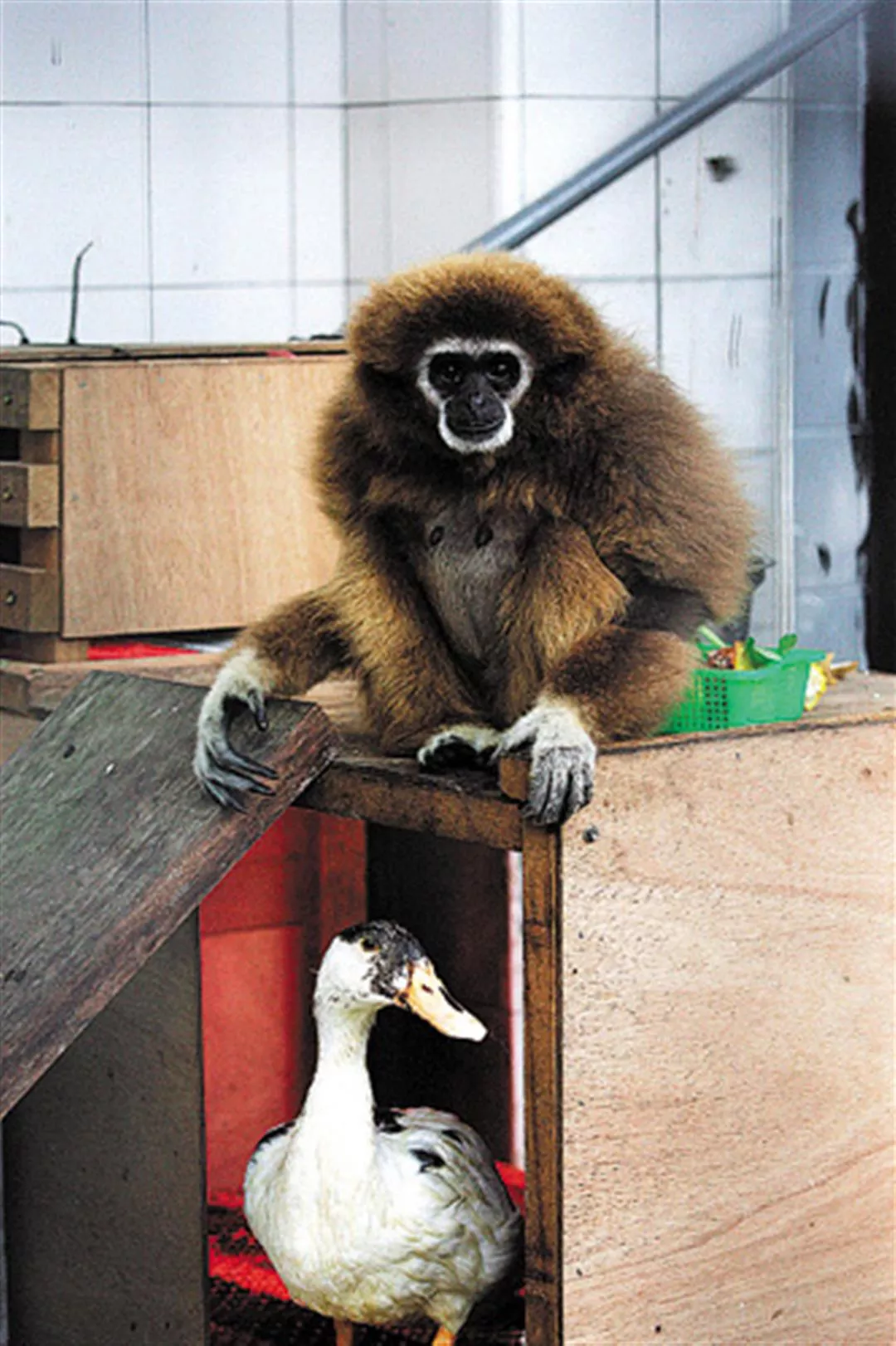 為了讓動物間彼此互動,豐富牠們的生活,中心常將動物混合照養。圖中被棄養的年老白手長臂猿「阿璐」,正關注地瞧著牠的同伴動物鴨子。