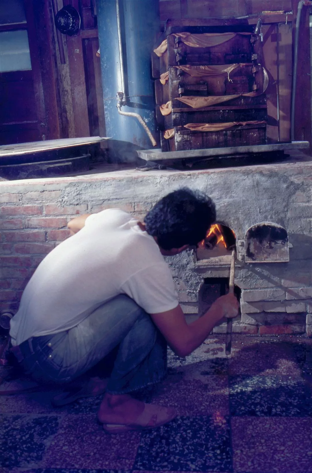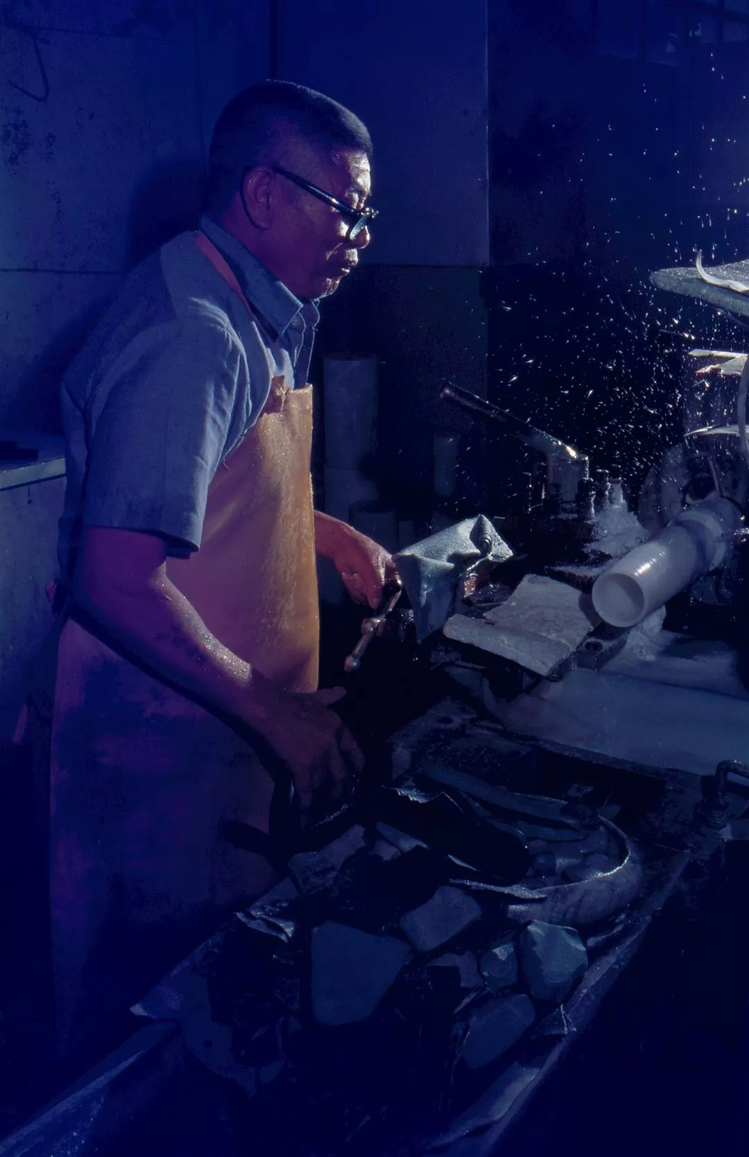 大理石工廠中,師傅正在琢磨一隻花瓶。四濺的水花是為減低磨擦溫度。(張良綱)