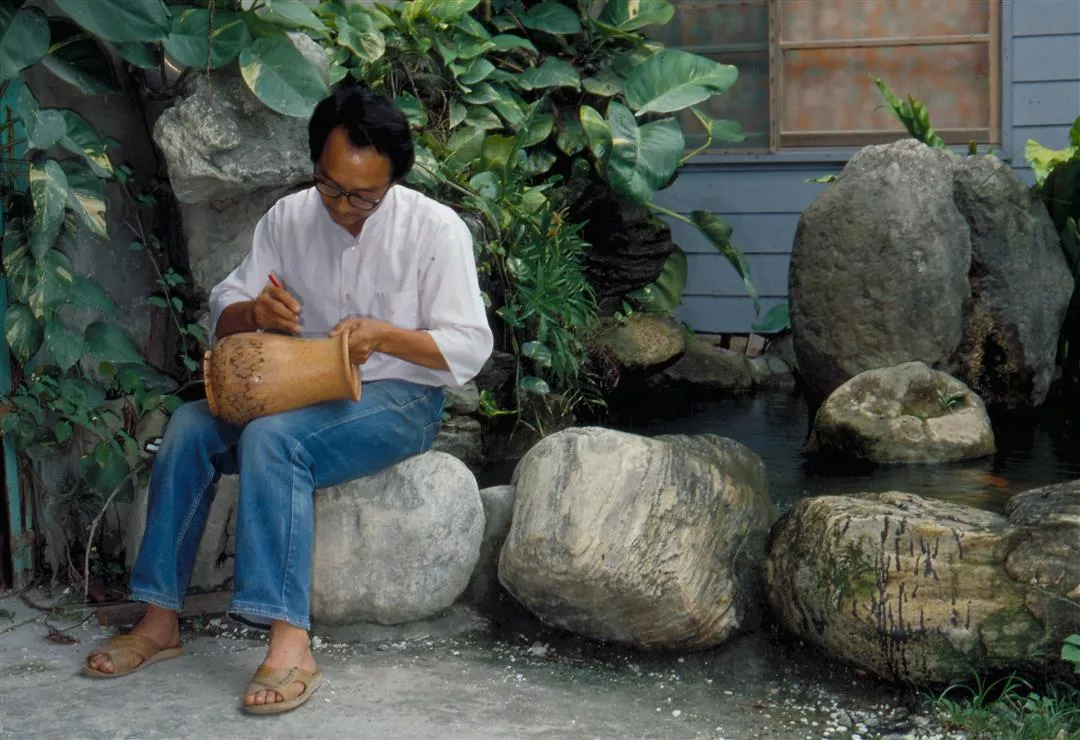 花蓮雕刻家林聰惠坐在後院工作。他喜歡花蓮的清新、安靜。(張良綱)