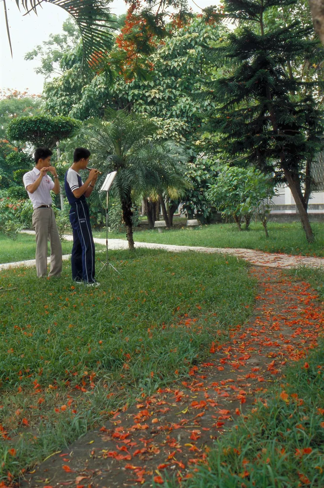 花蓮師專的學生在落紅滿徑的校園裏吹笛。(張良綱)