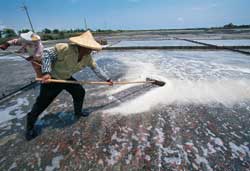 為了鹽山、也可以說是鹽田生態村的聖山,十多位鹽工清晨四點鐘就起來收鹽,一直到太陽日昇中天。
