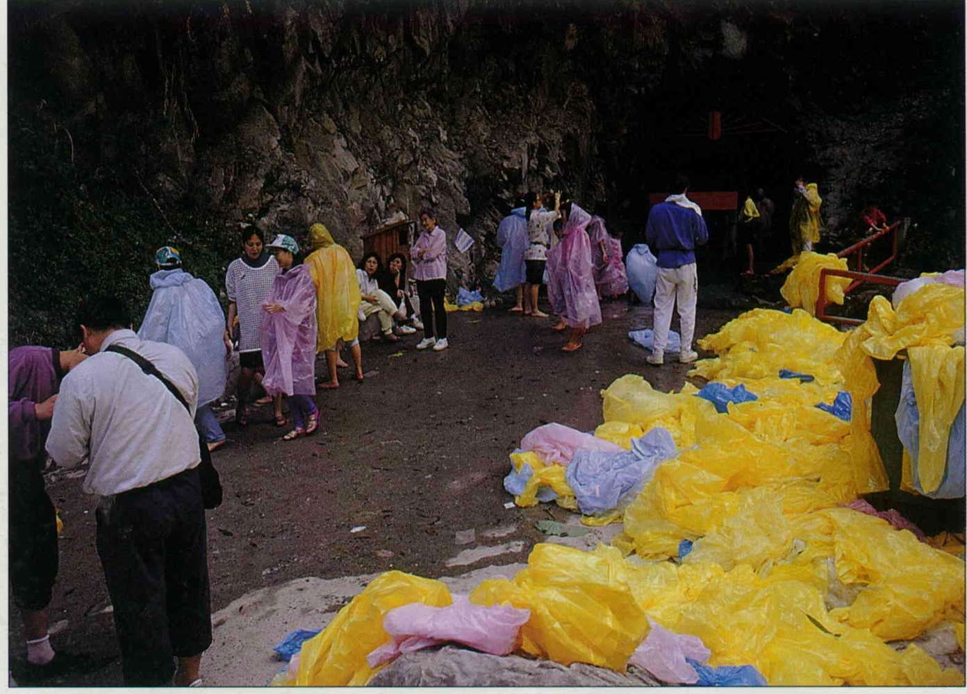 水濂洞裏的瀑布洩下的奇景難得一見,洞外則是滿地雨衣,也是一奇景。不過洞口已封閉,遊客不可擅入,免生危險。(鄭元慶)