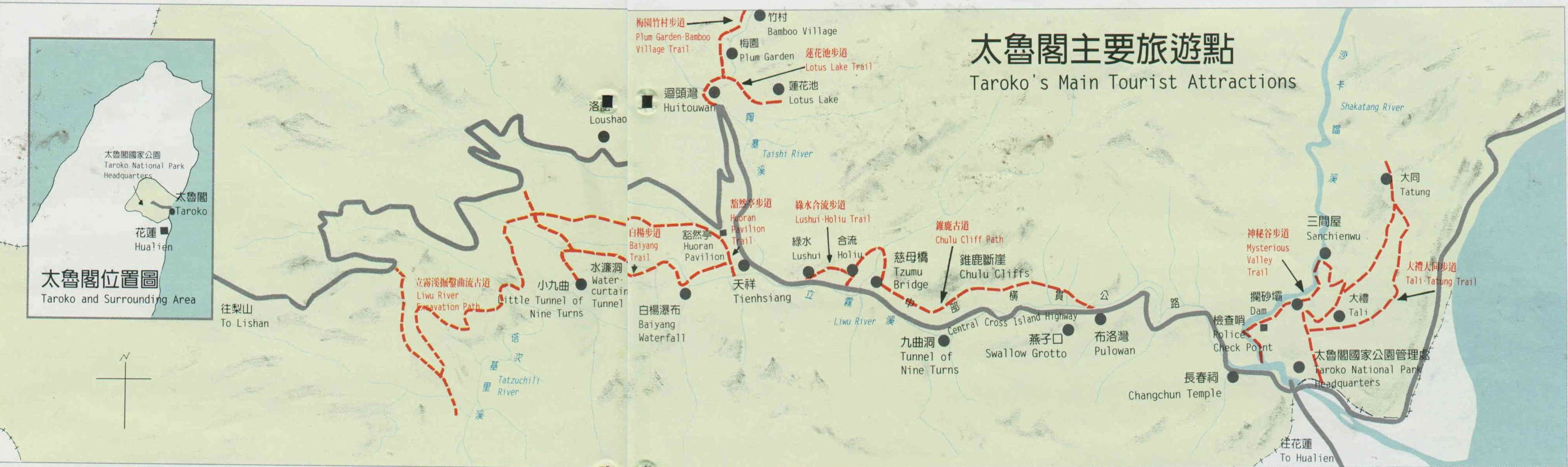 著名的太魯閣峽谷地區,是指從燕子口經靳珩橋、流芳橋、錐鹿隧道、九曲洞到慈母橋之間的路段,沿途十多公里,兩岸皆峭壁插天,僅留一線天。公路鑿穿山壁,曲折迴轉,十分壯觀。