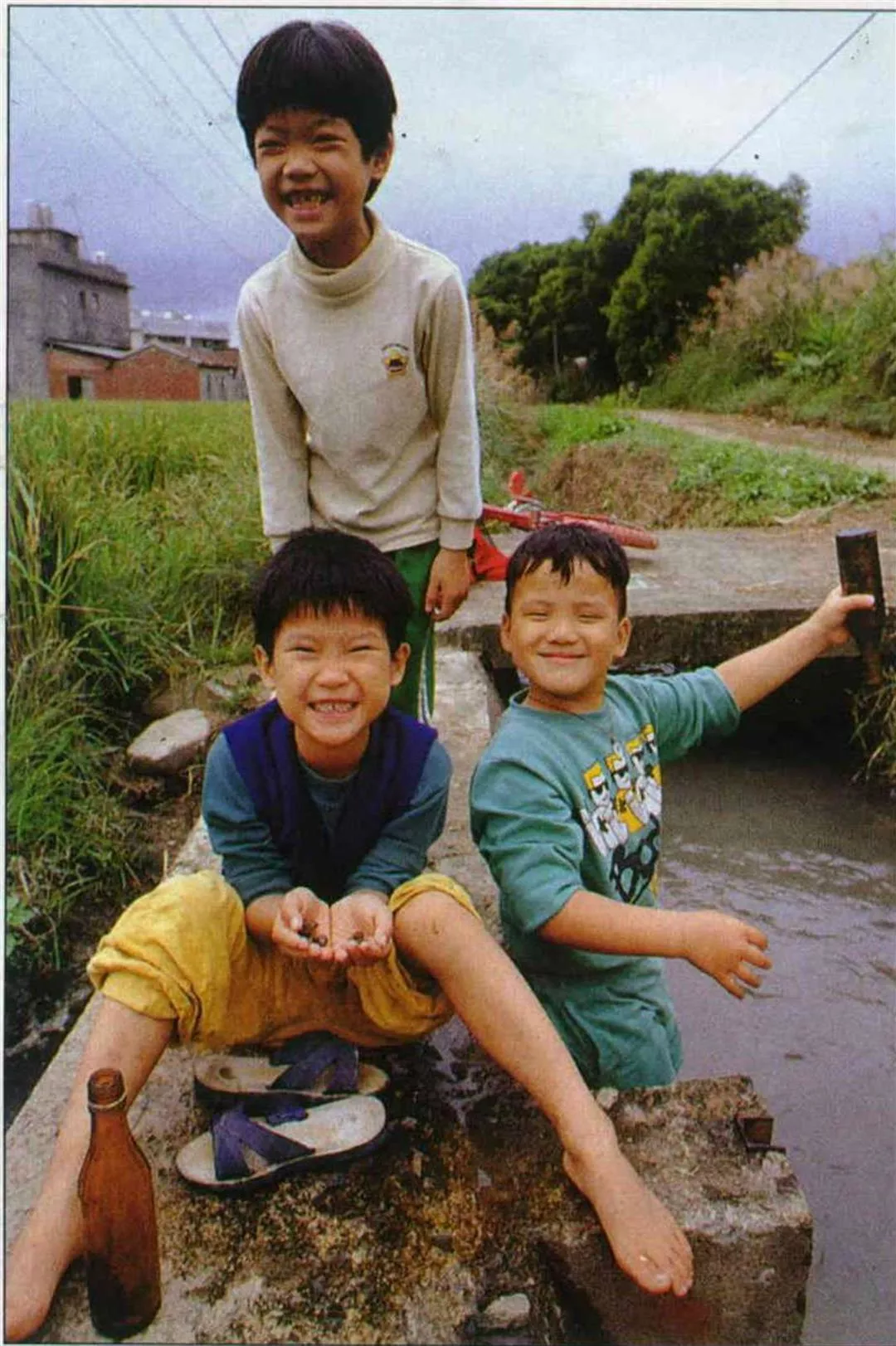 今天下午和弟弟妹妹到家後面的溪邊玩,路經竹林時,妹妹跑得好快,因為昨天我們在這裡看見一條青竹絲。我們赤腳在水中撈大肚魚和蛤仔,成對的蜻蜓由草叢間飛來,停在水面。弟弟忙著用蒼蠅紙黏樹上的蟬。