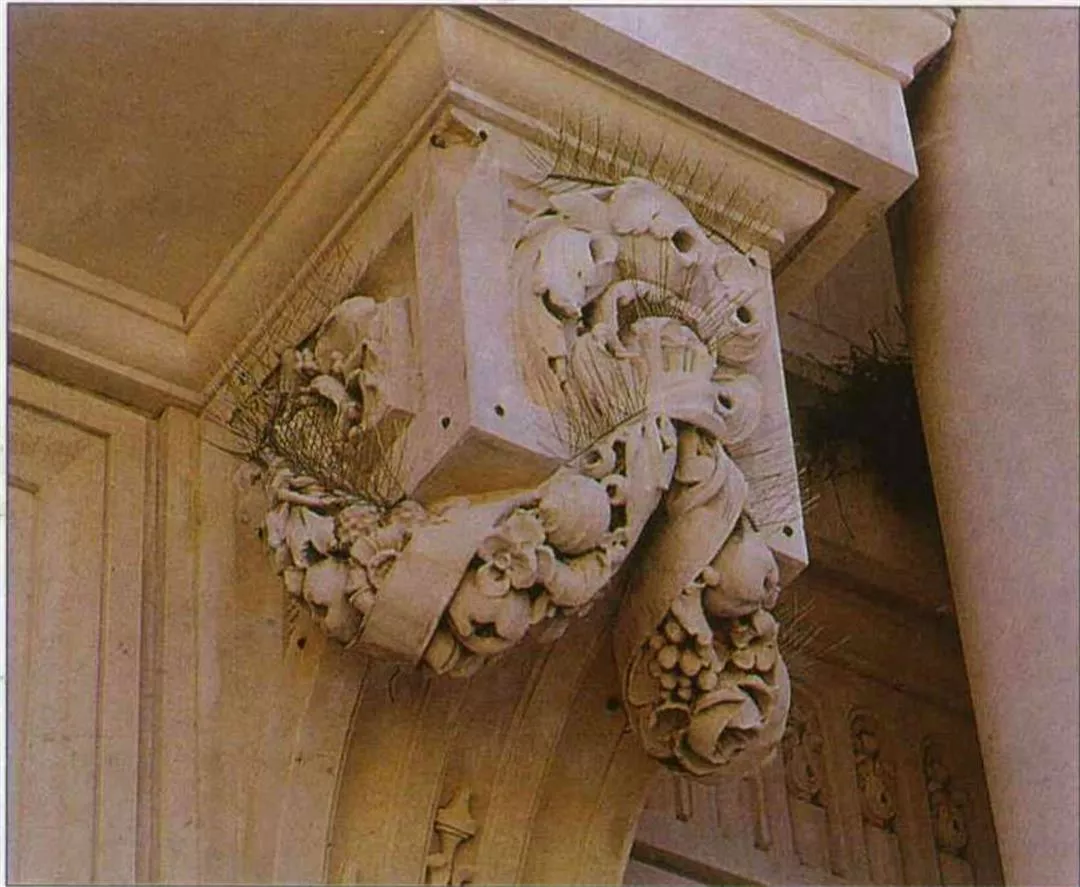 為了防範燕子的排洩物毀損建築,美國耶魯大學在雕飾上裝了「避鳥針」。(卜華志攝)