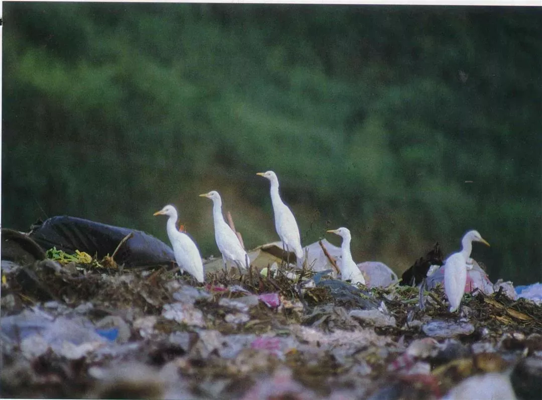 人類消耗所剩的垃圾成了鳥兒的資源。圖為福德坑垃圾場吸引了一群雪白的鷺鷥。(張良綱攝)
