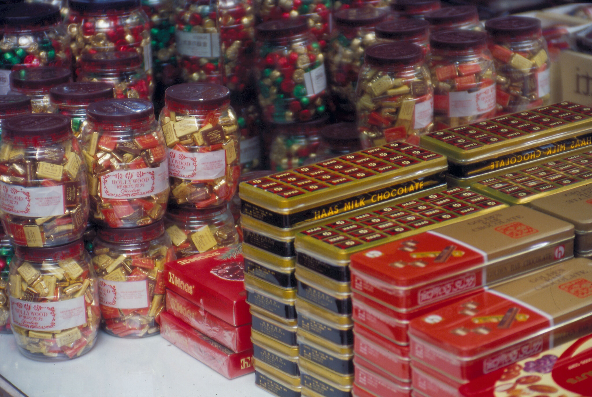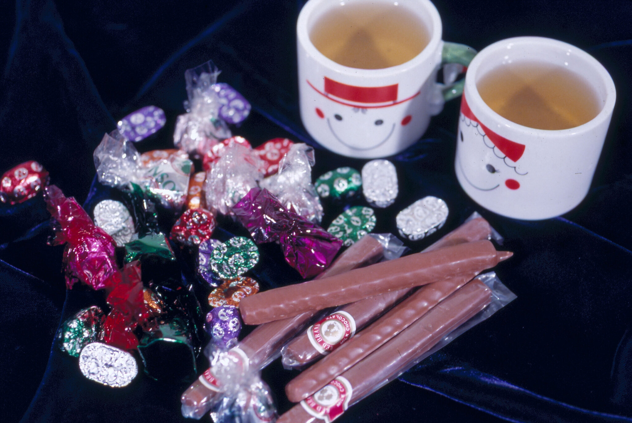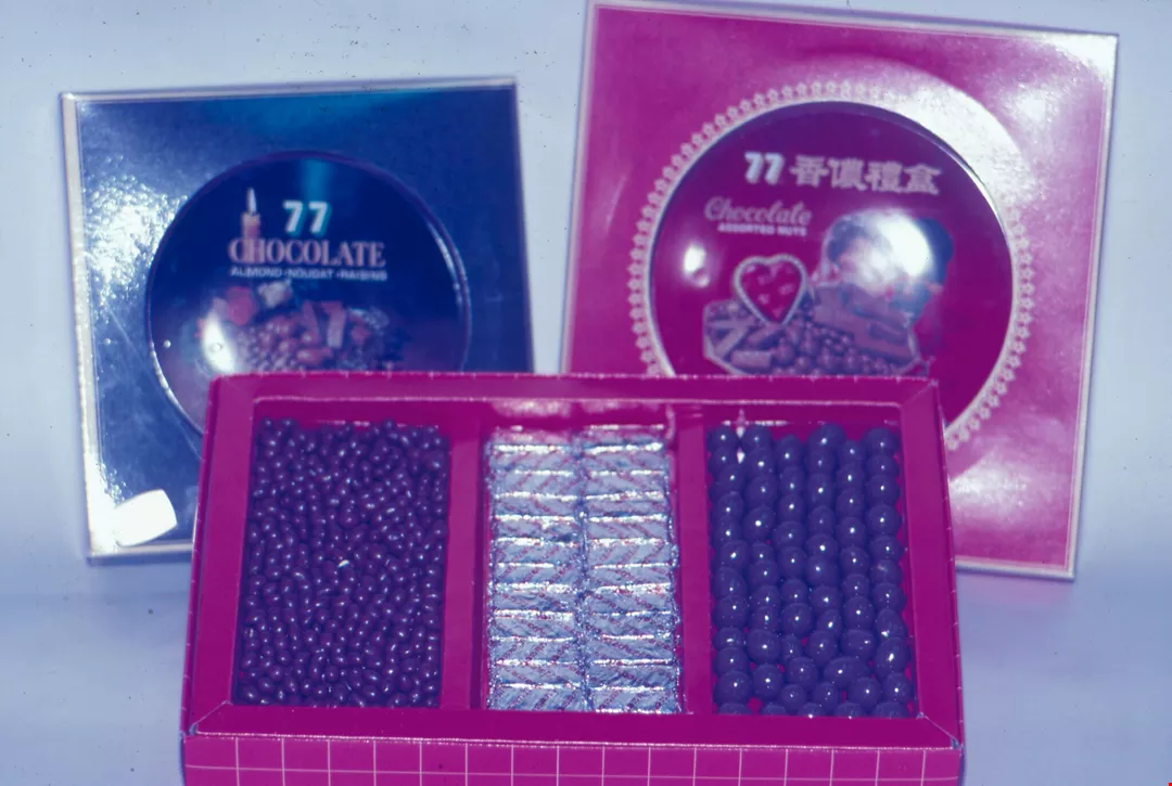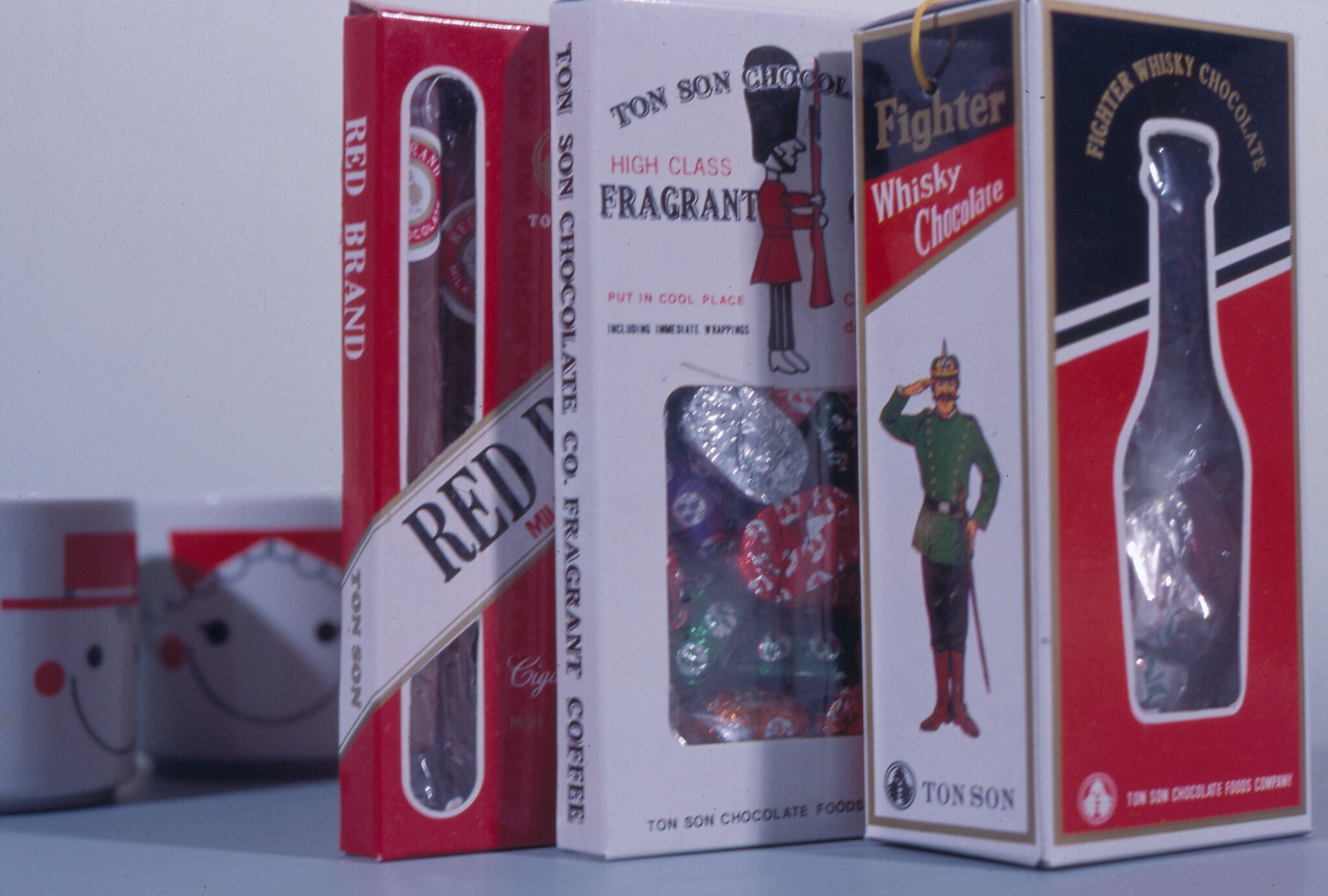圖1.2:三款同森牌巧克力——長棒狀、顆粒狀和巧克力酒糖。(鄭元慶)