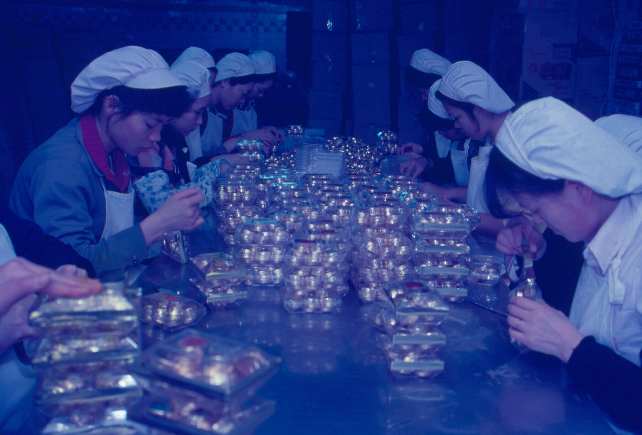圖4:工人將金紙包裝的巧克力裝盒。(鄭元慶)