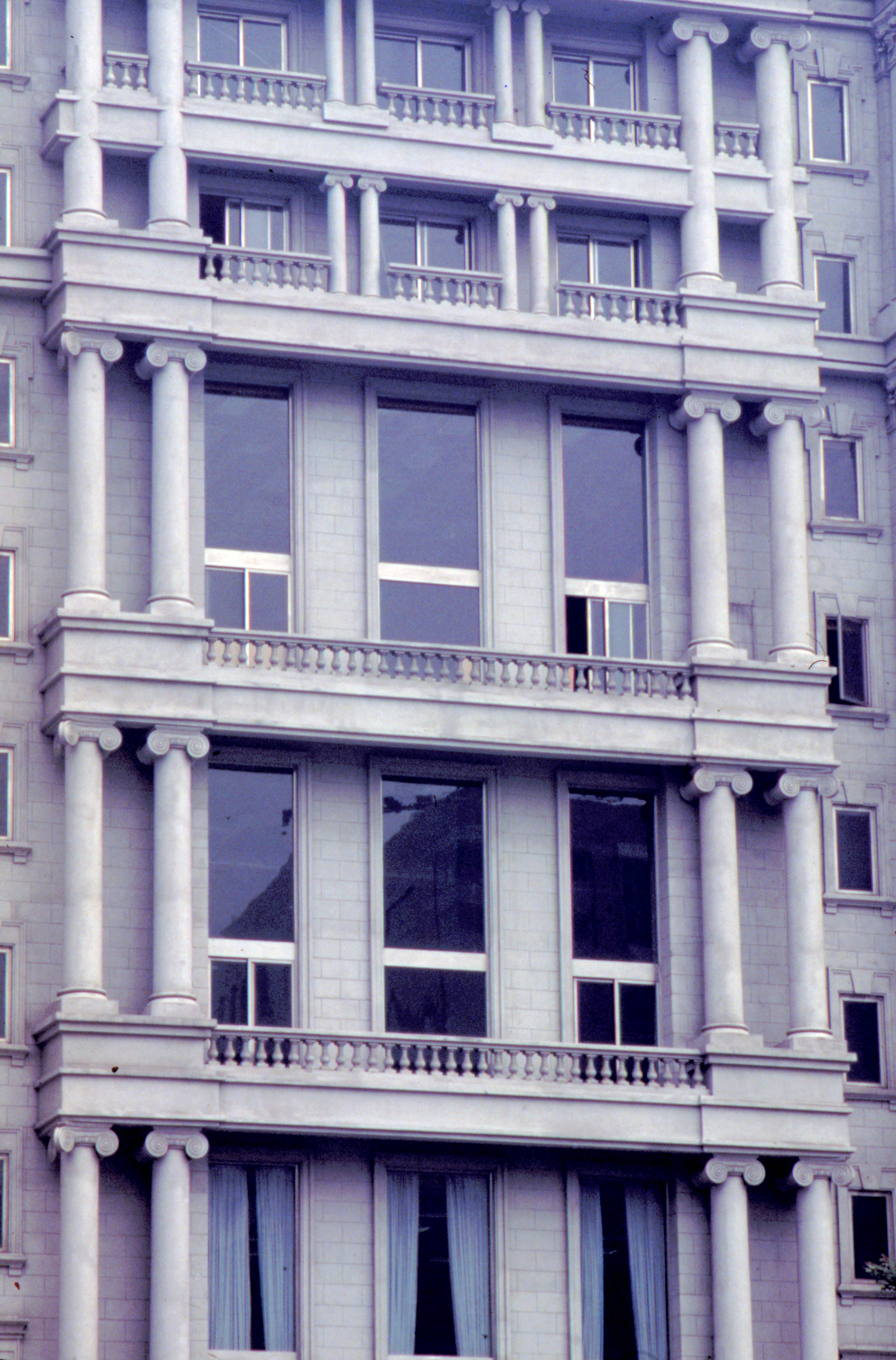 玻璃帷幕、羅馬圓柱...,彷彿一一為都市訴說著繁華、進步。(鄭元慶)