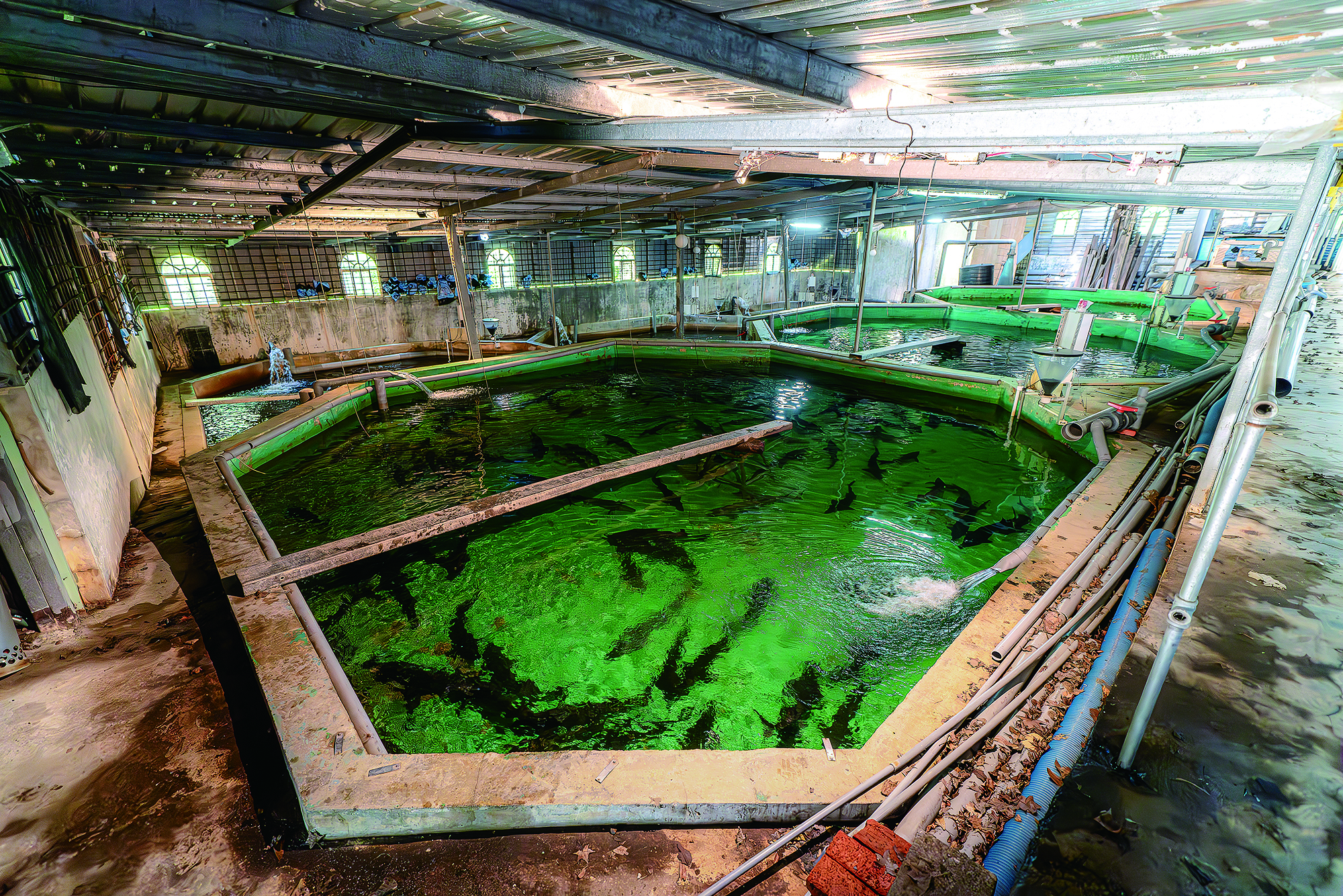目前的場內,約有30幾池養殖池,共計2萬條魚。設置於室內的養殖場,白天不開燈,維持昏暗的光線,仿擬鱘龍魚生活的原生環境。八角造型的水池排汙效果佳,另配有自動投餌機,並連線智慧監控系統;每一池還會飼養少數的肉食性墨瑞鱈魚,能將夾帶在溪水中,由魚卵孵化出現的其他魚種吃掉,達到生物防治的效果。