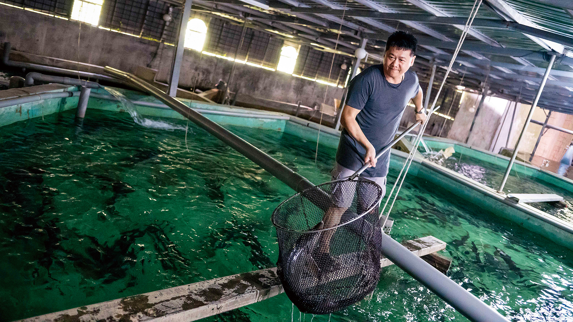 半路入行的林典,靠著不斷精進,成為鱘龍魚專家。(千戶傳奇生態農場提供)