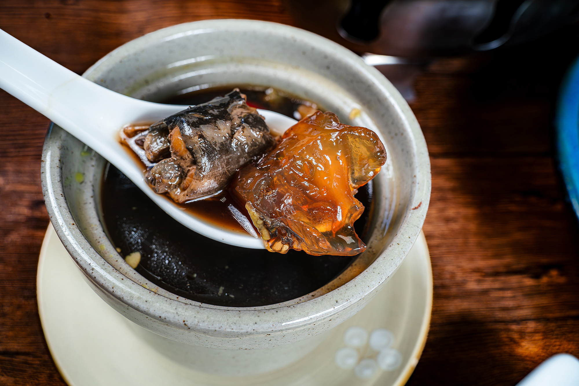 由於鱘龍魚身上並沒有多數魚類存在的肌間細刺,唯有不少軟骨,經長時間熬煮,會全數融化為魚膠,近乎無刺的優點,兼具低脂肪、高蛋白、富含膠原蛋白等優點,不飽和脂肪酸更是一般魚類的三倍。