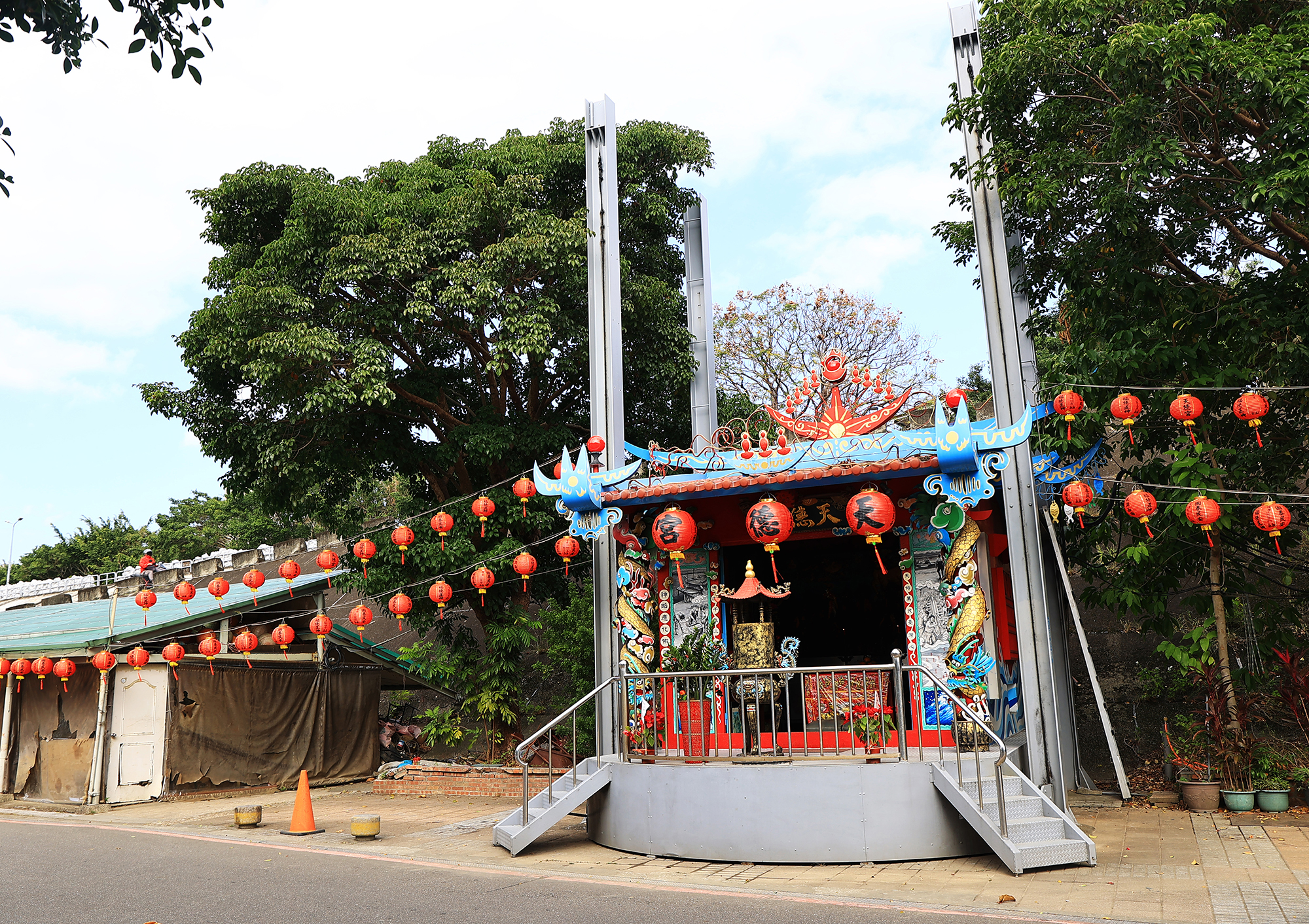 「這裡面有許多台灣常民的生命力跟創意。」賴伯威舉了各自位在基隆河左右岸的「打帶跑廟」和「升降廟」。在百齡橋下的「打帶跑廟」百齡寺,廟體長出四顆輪子,像活動攤販一般可自由移動,「我們剛開始以為是在躲建管單位或警察的取締,結果發現不是,它是在躲洪水。」當洪水來的時候,它可以水平移動至高處。