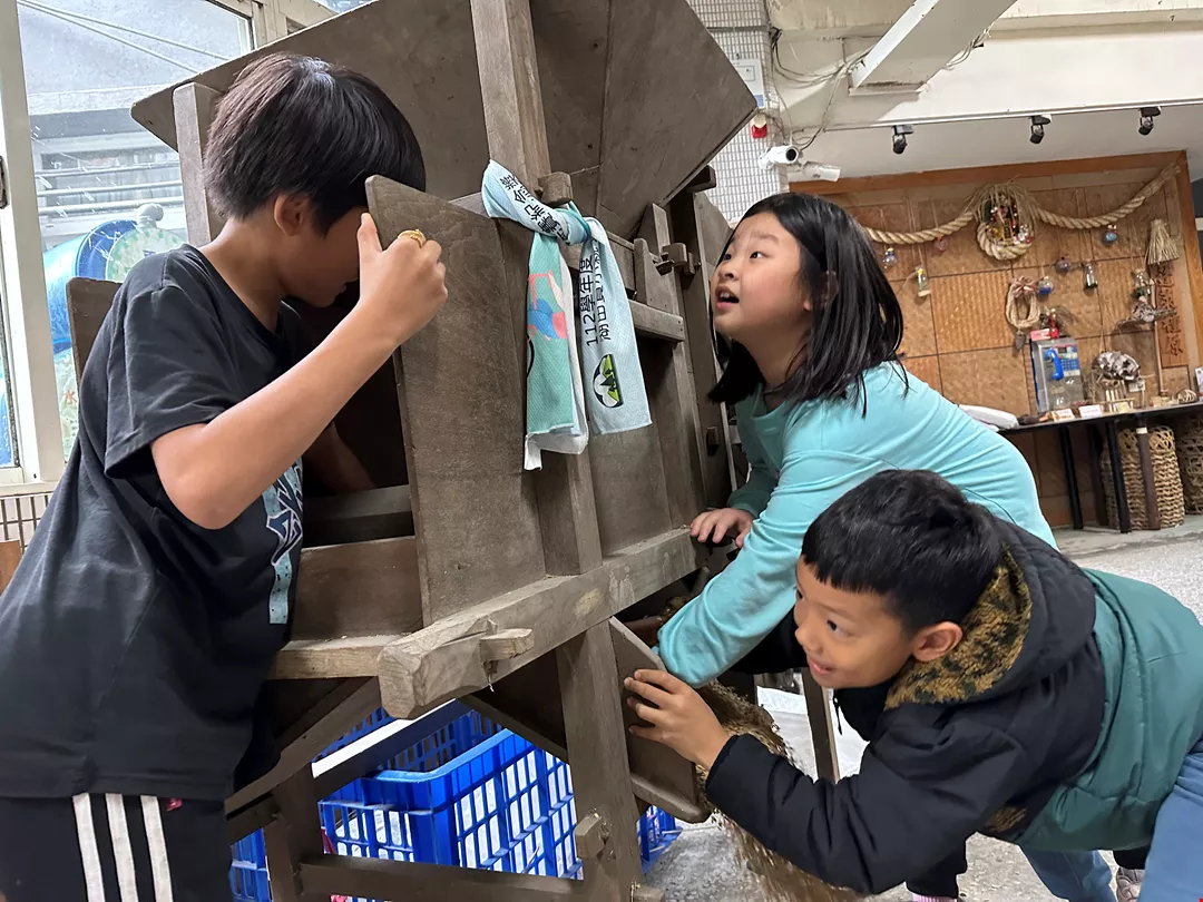 路過的學童看到罕見的風鼓車在運轉,紛紛好奇圍觀,有人忍不住動手體驗碾米的「樂趣」,也有人邊轉動風鼓一邊驚呼:「哇,我是大力士耶。」陳永如則提醒學童離開風口:「這個(稻穀)有稻毛,沾黏在身上,身體會癢喔。」