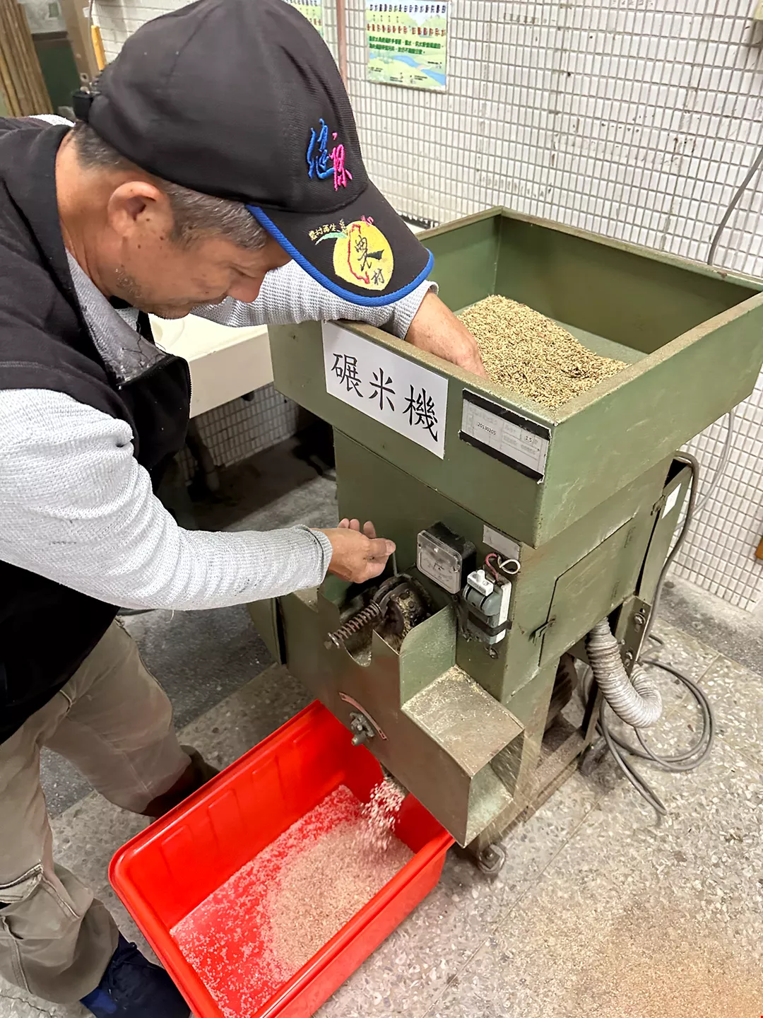 竹子湖蓬萊米原種田榖東俱樂部召集人陳永如操作碾米機碾米。(郭美瑜攝)