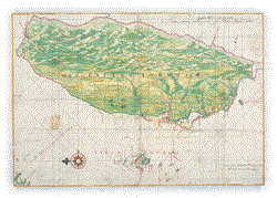 十七世紀,荷蘭人派船環島後,繪製出一座蕃薯形的單獨島嶼,修正了過去將台灣畫成一串群島的錯誤。圖為一六四○年的《澎湖島及福爾摩沙海島圖》。(荷蘭海牙國家檔案館藏)