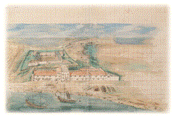 (右)將《熱蘭遮城與長官官邸鳥瞰圖》與台南安平古堡對照,三百多年前荷蘭人的殖民情形頗為具體。(荷蘭海牙國家檔案館藏)