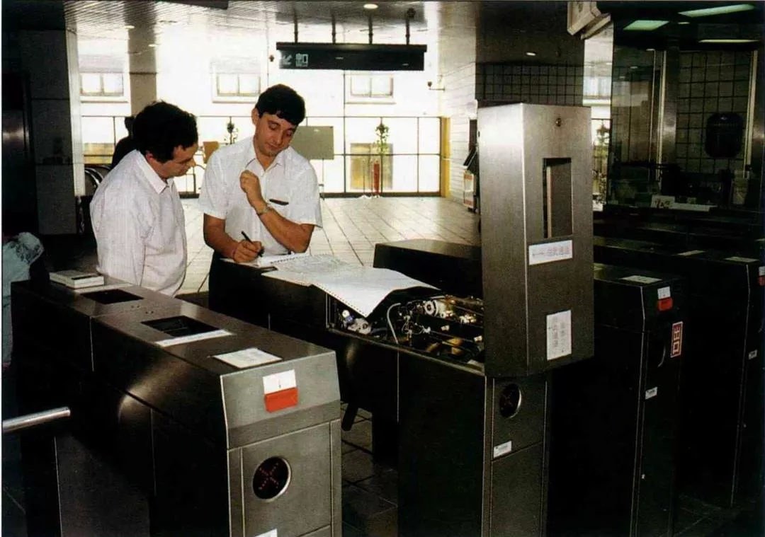 營運通車後,木柵線的許多瑕疵在鉅量載客下——浮現。圖為兩位外籍技師在車站內搶修驗票閘門。(薛繼光)