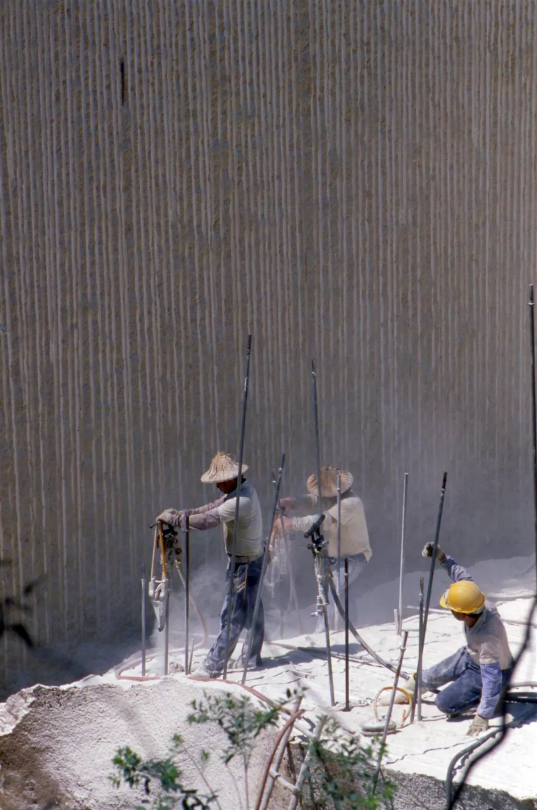 (左)東河橋附近,正在開採大理石礦。工人將鐵條釘入石內,便於切割。(張良綱)