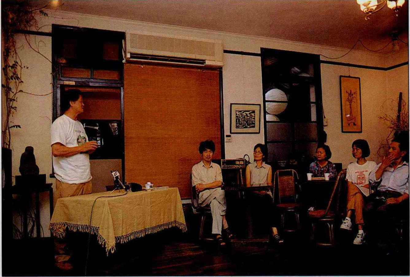 紫藤廬常舉辦藝文活動,有「文化沙龍」之稱,也因此更為文化人所珍惜,成為這次聲援保留的主力。圖為小說家黃春明的演講一景,中坐者為周渝夫婦。