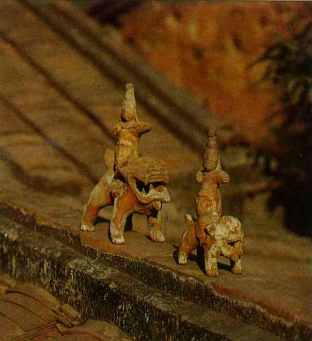 百獸之王的模樣在漢代沿著絲路傳入中國,時人被這陌生的動物所震懾,留下「銅頭鐵額、目光如電,日走五百里,每一吼則百獸辟易,馬皆溺血」及能「拉虎、吞貔、裂犀、分象」等形容。在百聞難得一見及勇猛的傳說下,獅子由現實動物添附神性、變成似幻似真的中國聖獸,也加入厭勝物的守衛行列。