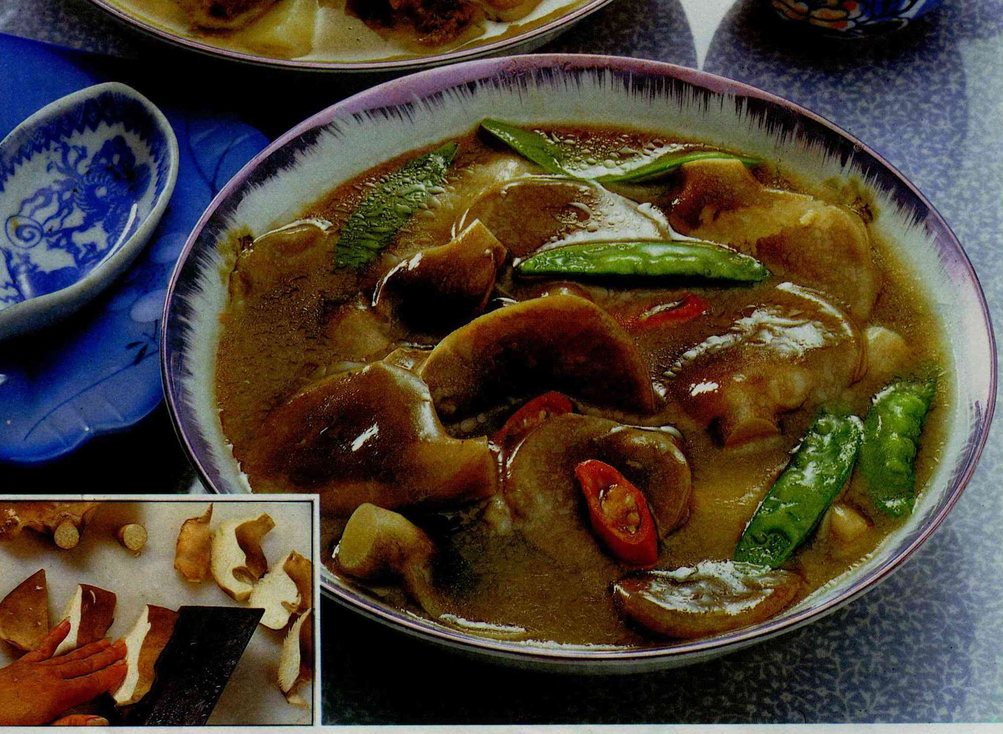 蠔油鮑魚菇 文‧漢光公司 1985 3月 EN 分享: 材料:鮑魚菇一片、沙拉油四大匙、蒜茸1/2大匙、豌豆二兩、紅椒一根、高湯半碗。 調味料:蠔油二大匙、糖一大匙、胡椒粉1/3茶匙、味精1/2茶匙。 淋加料:太白粉一大匙、麻油一茶匙。 做法: 1.豌豆去頭尾、莢筋,洗淨備用。 2.鮑魚菇切去根處,再切成大片(鮑魚菇若直徑只有一寸半左右可不必切)洗淨,用滾水加一茶匙鹽,煮滾一分鐘半。然後撈置於清水中,待涼後撈起。 3.油入鍋,放進蒜茸炒香,再放入鮑魚菇、豌豆、紅椒,約翻炒一分鐘。 4.加入高湯、調味料,待滾後澆下淋加料即可食用。 分享: