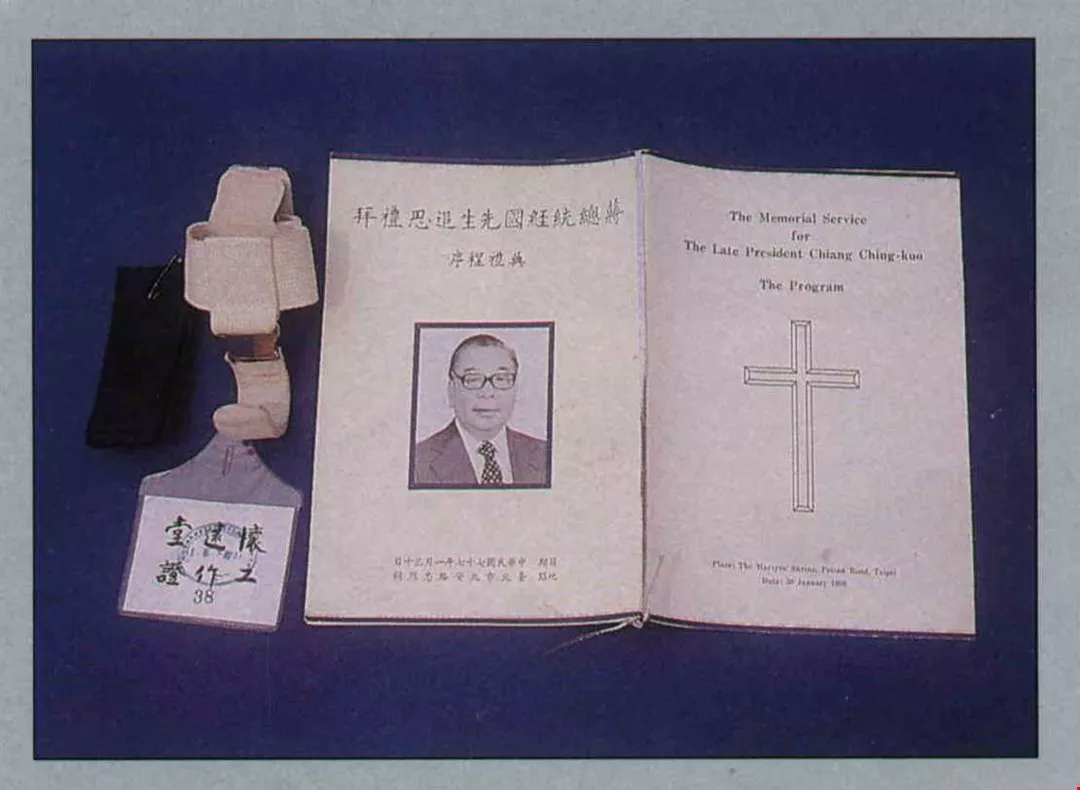 (左)懷遠堂值勤工作證、移靈所用的鉤環、黑紗、奉厝大典行程表,是七海侍衛官永遠的回憶。(郭燕陸提供)