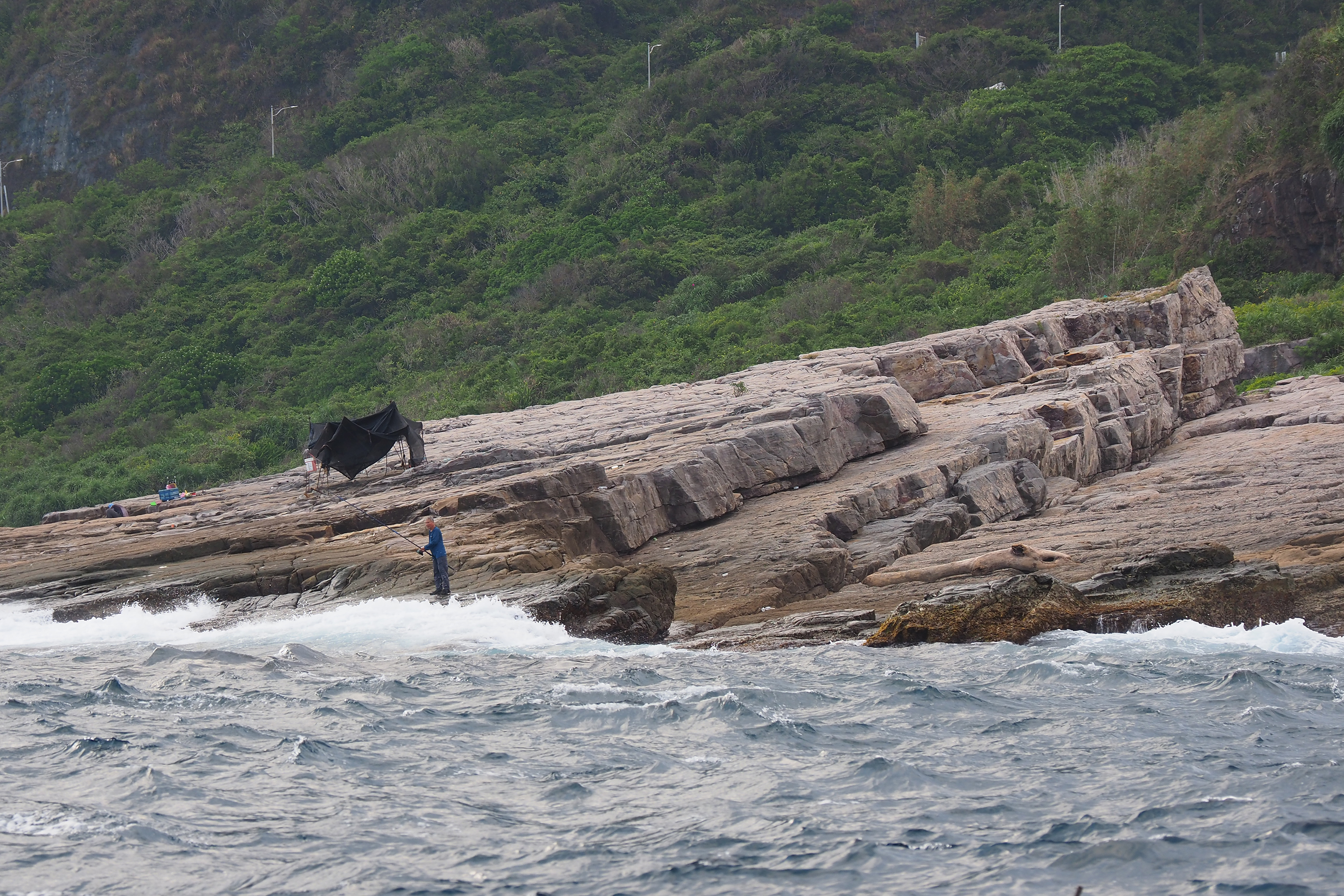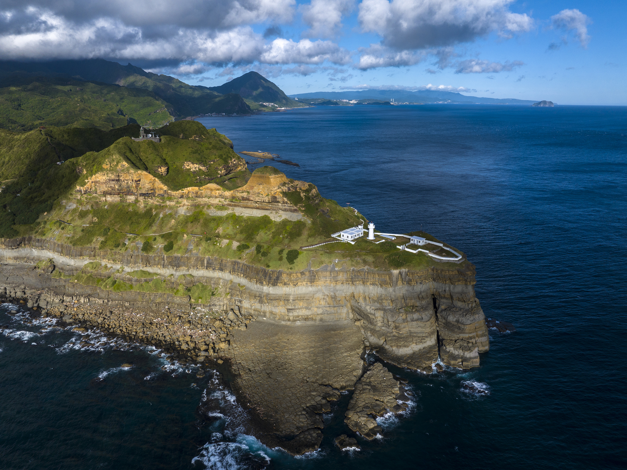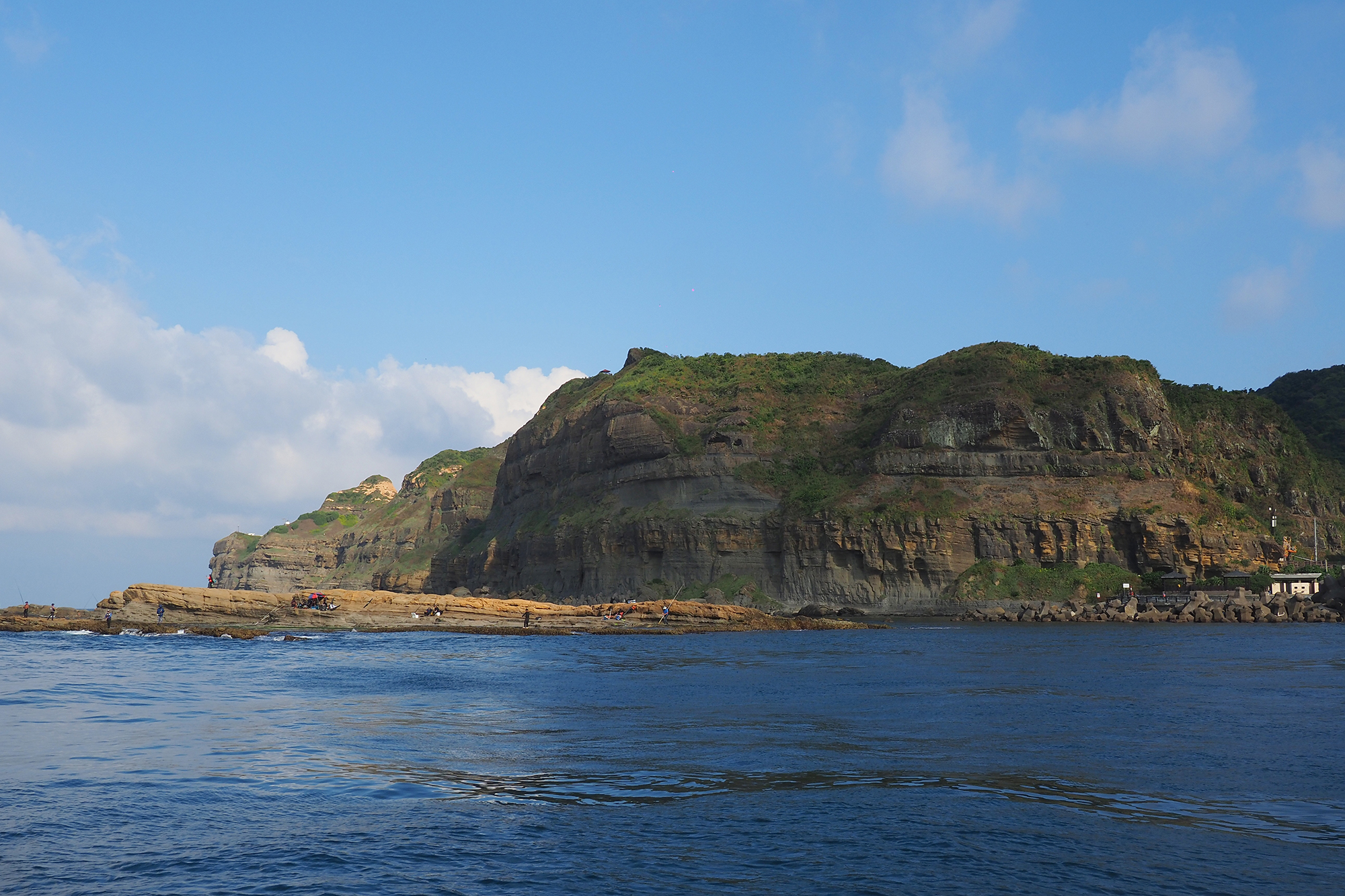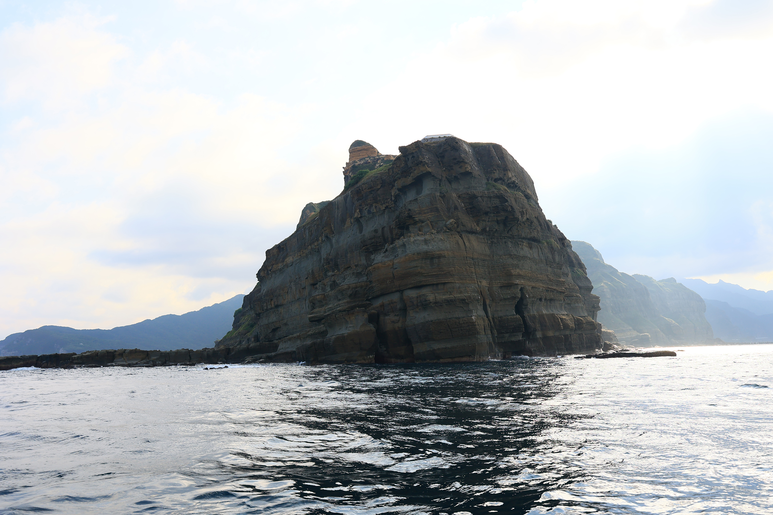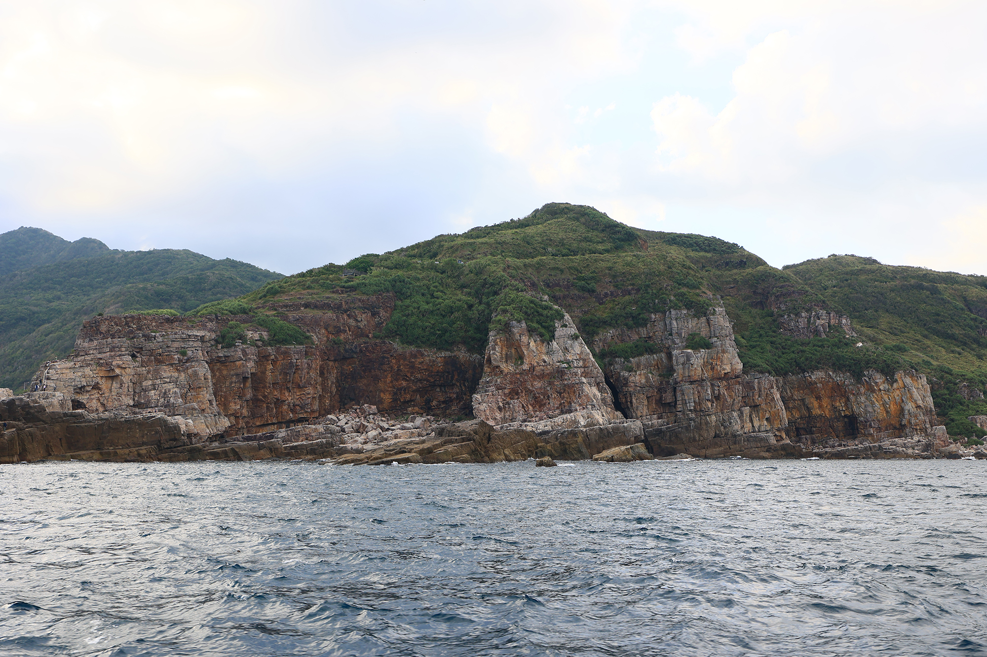從海上回望東北角的陸地,可以看到岩石互層,就像是千層派。