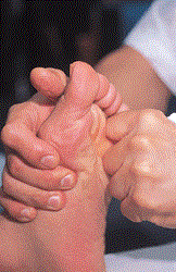 居住在台東長濱鄉的吳若石神父,二十年來致力推廣腳底按摩。圖為他為遠道而來的日本朋友示範手指輕扣腳底的手法。