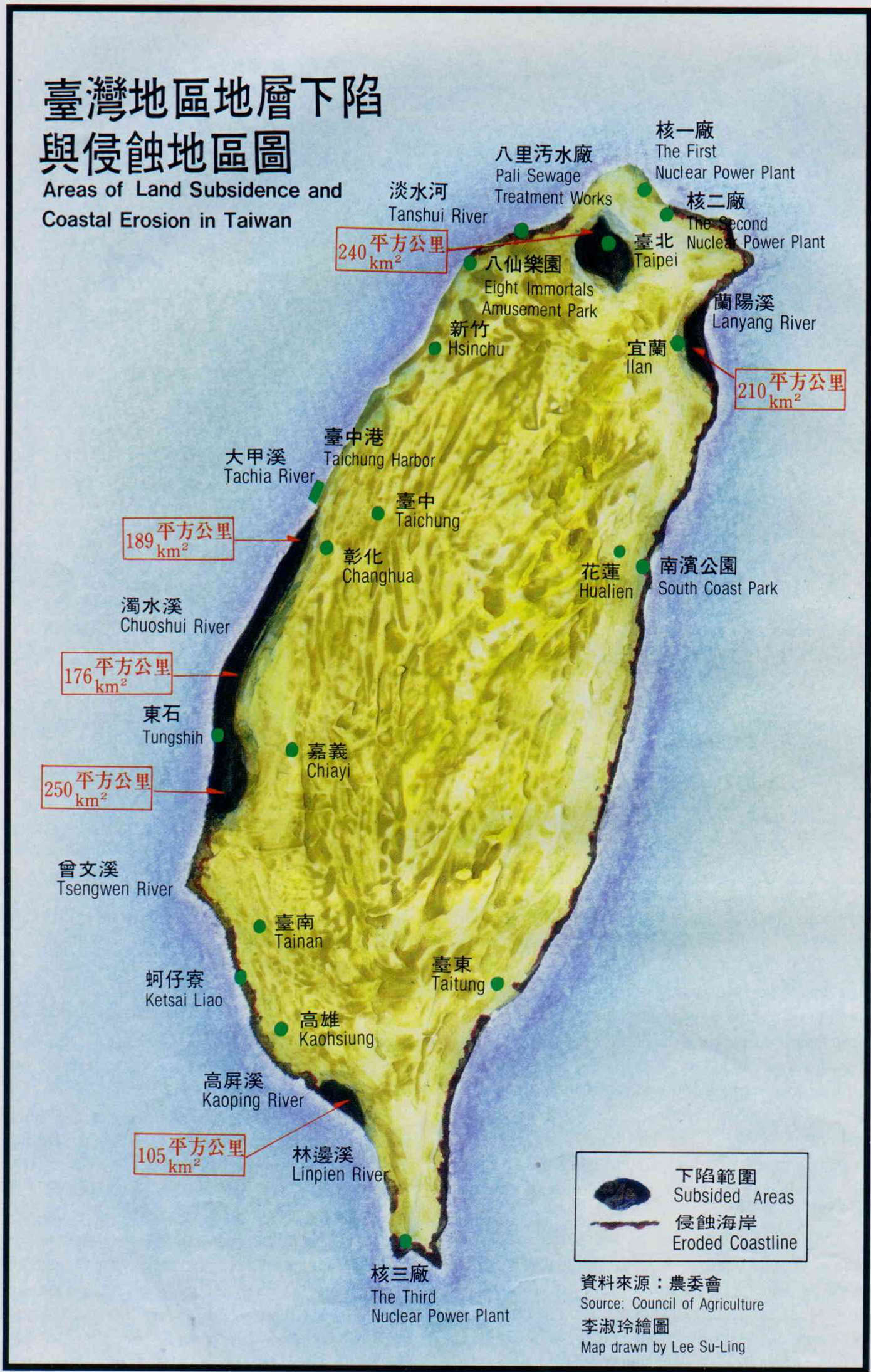 「全島三分之一的抽水量又都分佈在沿海岸二公里的帶狀地區」,成功大學副教授周乃昉在「水資源開發展望」報告中指出,其中以西海岸彰化至嘉義,及南部屏東林邊一帶超抽最嚴重。