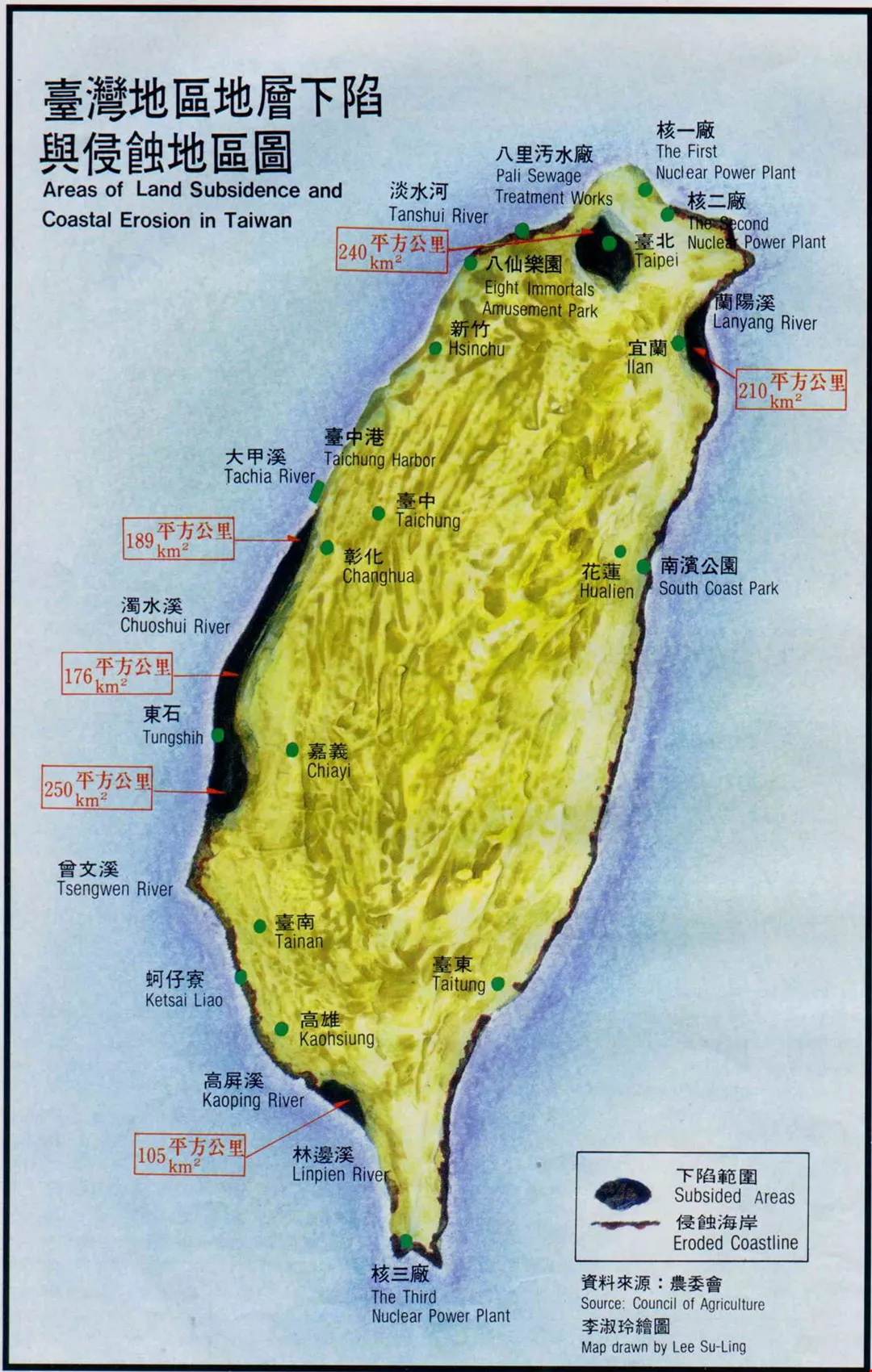 三年前,省政府農林廳航測地層下陷嚴重的屏東地形,發現民國六十五年來,海岸不停內移,最大距離達二百公尺。屏東縣內陸縱深最窄處只有二公里,以此速度,十個十五年,海浪就可以直抵山腳。過去十年,屏東土地減少了卅八公頃,等於流失近五十個足球場。以後人們到南端的墾丁,恐怕得轉由台東過去了。