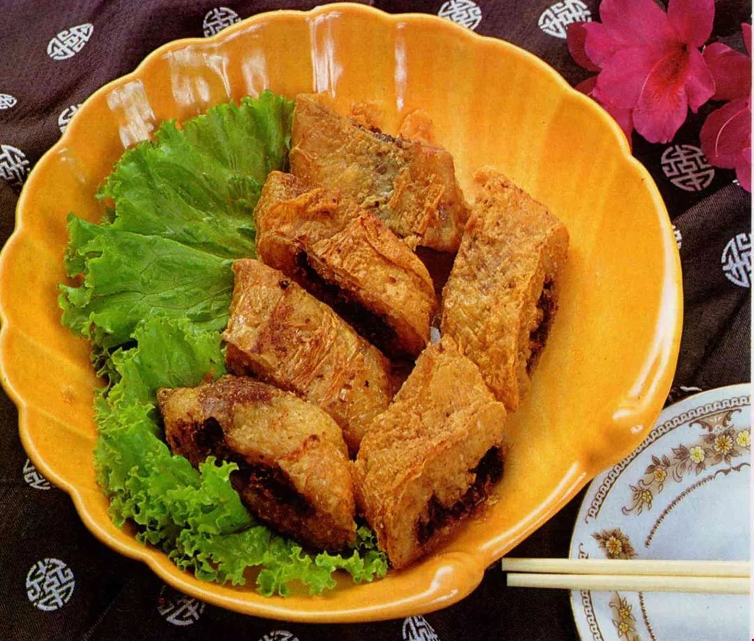 圖4:豆腐皮包糯米、豆沙捲成長條,油炸後切塊,便是香軟甘甜的糯米卷尖。(鐘永和/漢聲雜誌/漢光公司/味全公司/糧食局)