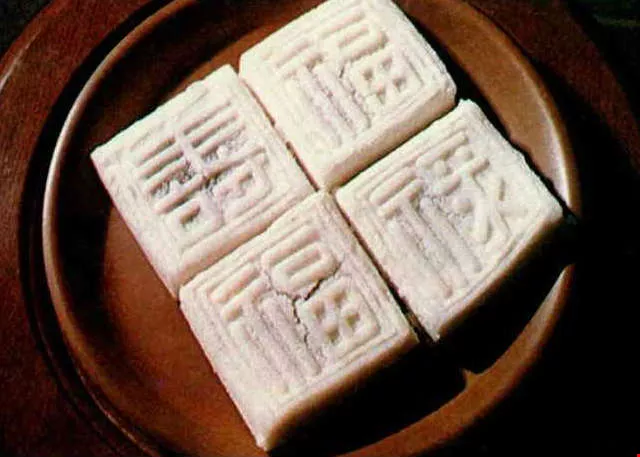 潔白半透明的方糕又叫「水晶糕」,是以糯米粉加餡蒸制的蘇式點心。雪白瑩亮的糕面,印著福祿壽喜財的吉祥字樣,隱約看得到赭紅的桂花豆沙餡,入口軟滑黏香。