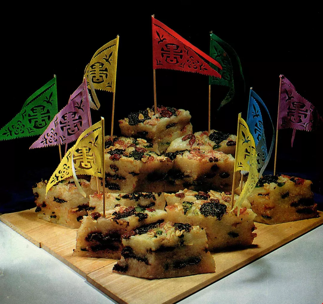 下圖:重陽糕插上五色繽紛的小旗,充滿節慶的熱鬧氣氛。(鐘永和/漢聲雜誌/漢光公司/味全公司/糧食局)