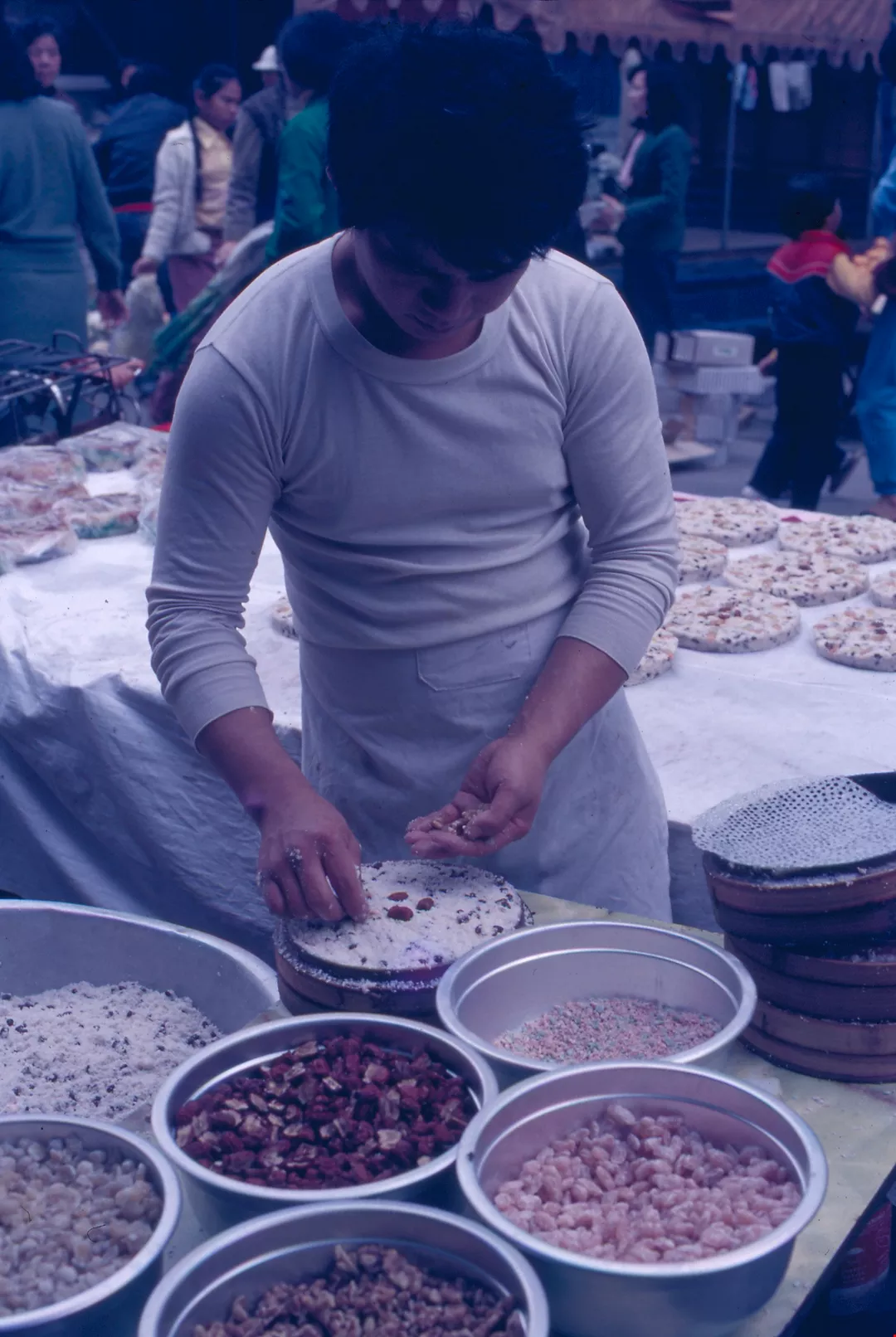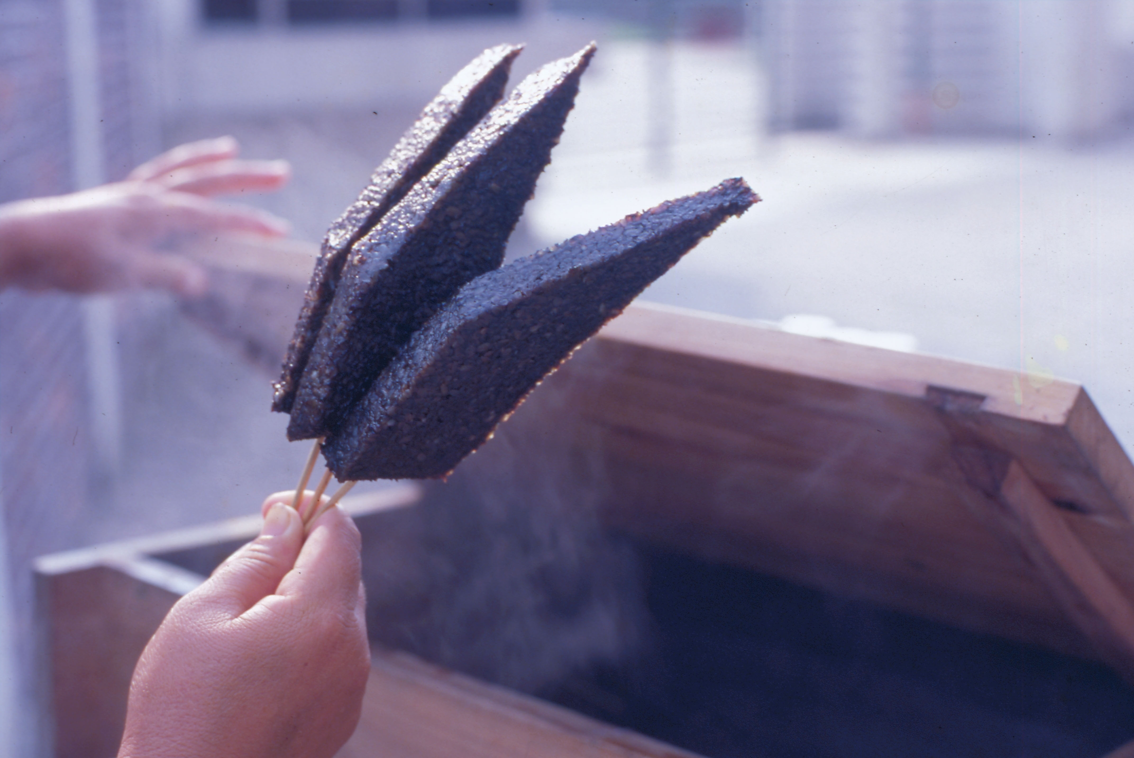 圖6:街頭常見小販出售價廉物美的豬血糕,滾層花生粉、蘸些辣椒醬趁熱食用,十分美味。(鐘永和/漢聲雜誌/漢光公司/味全公司/糧食局)
