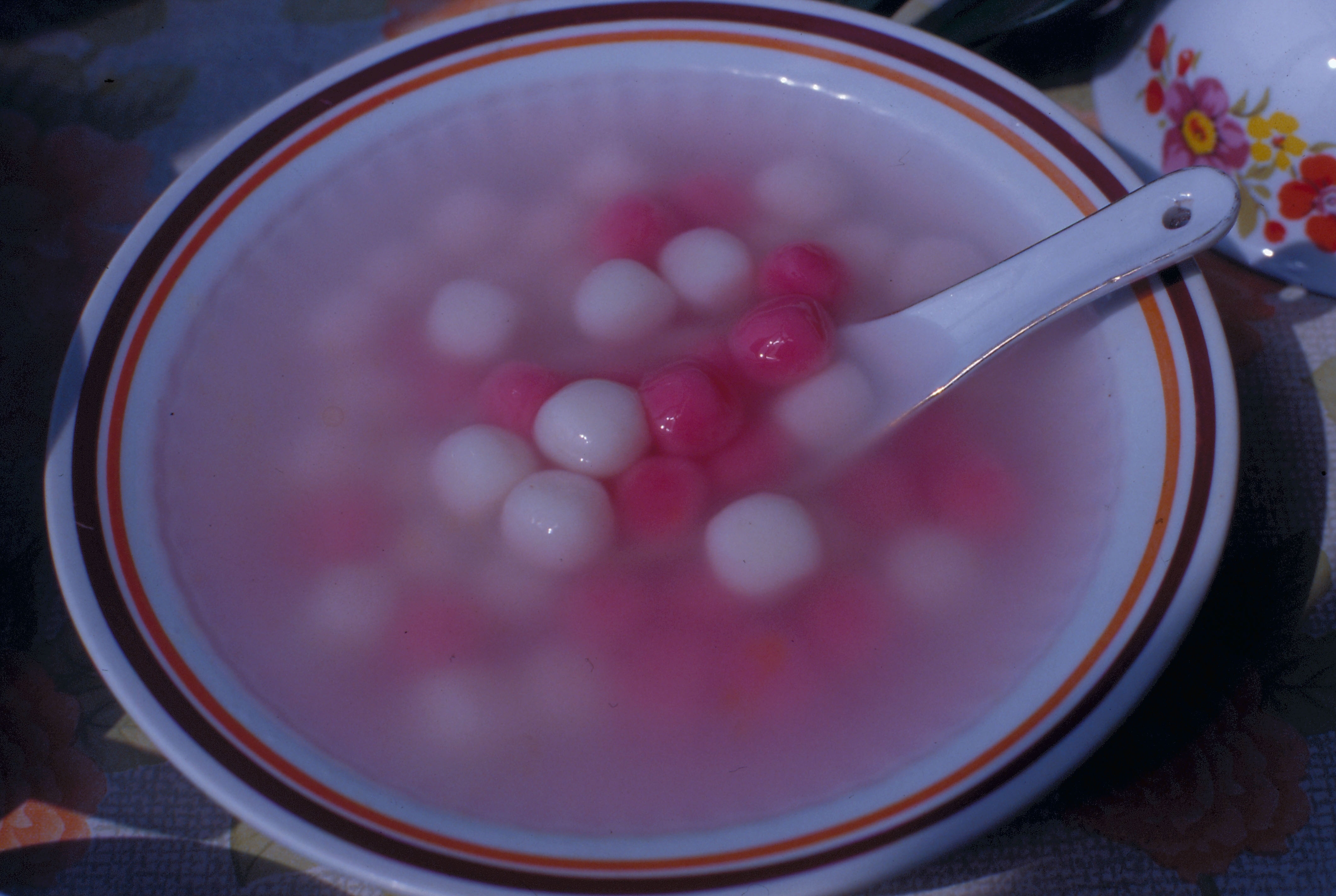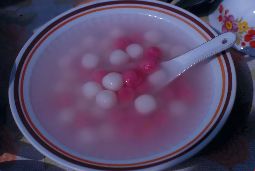 加入一點紅顏料的紅色小圓仔,與白色的放在一起,非常悅目,可加入花生湯、紅豆湯或酒釀湯中,滋味極美。