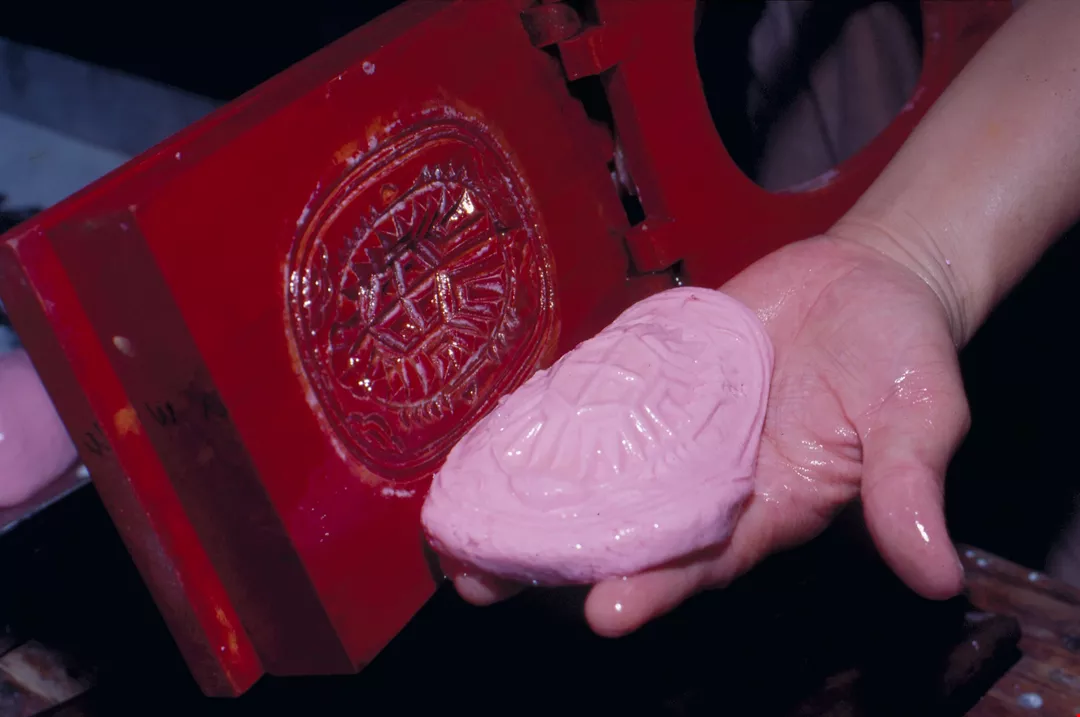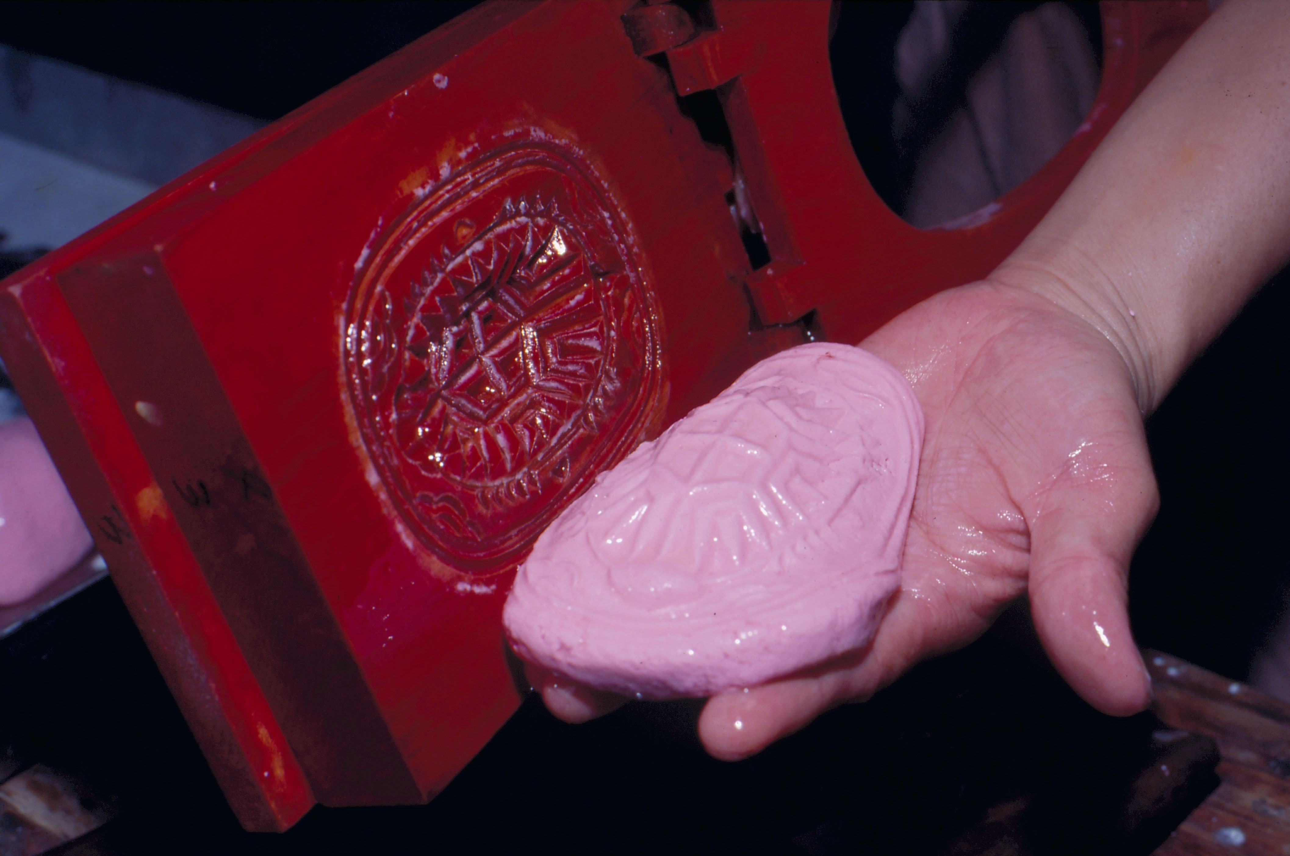 圖3:加餡的粿粉團在刻有龜紋的印模上壓花,即成「紅龜粿」。(鐘永和/漢聲雜誌/漢光公司/味全公司/糧食局)